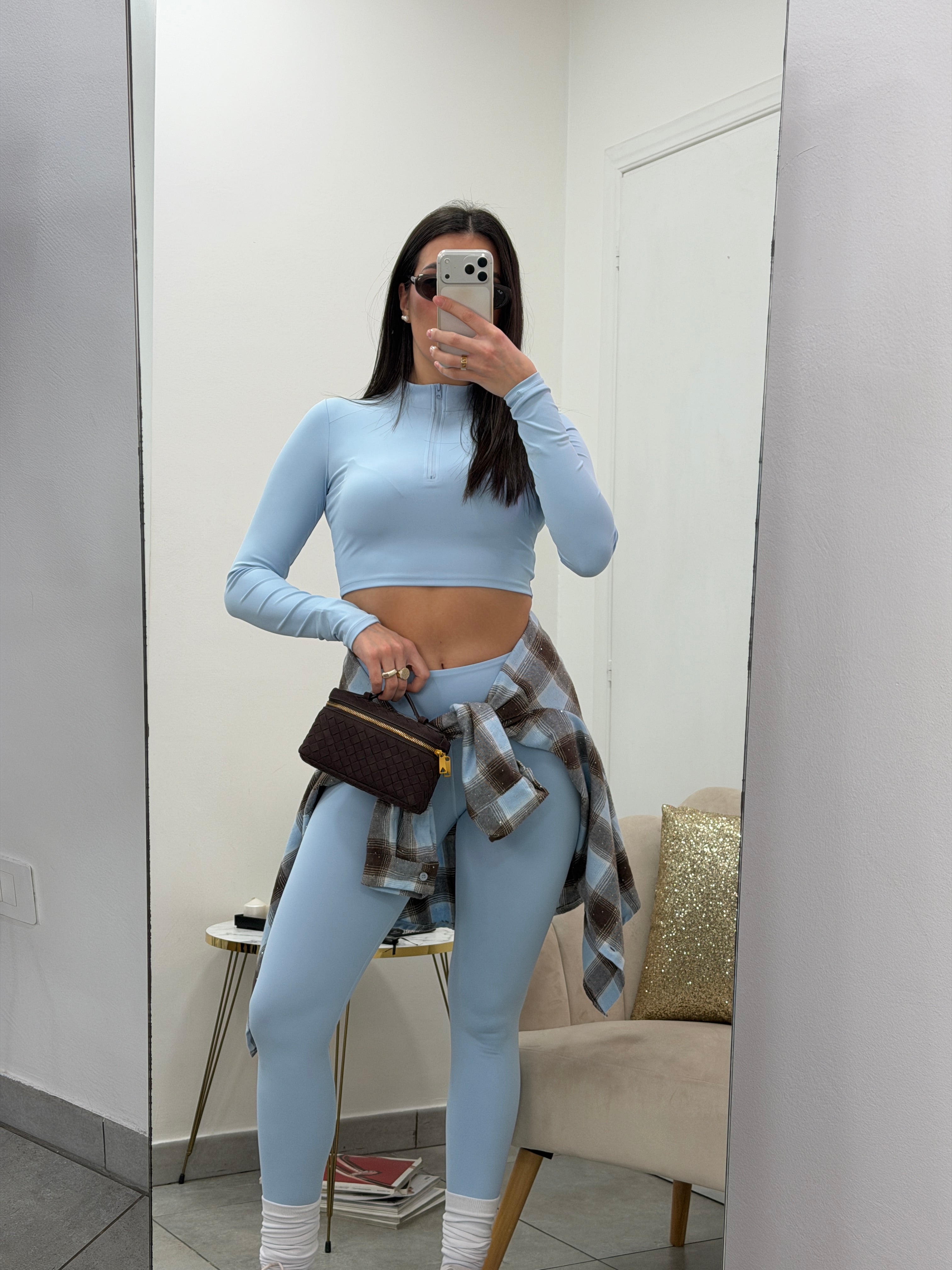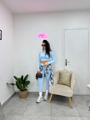 Coordinato due pezzi composto da crop top manica lunga e zip, leggings con fascia elastica alta.