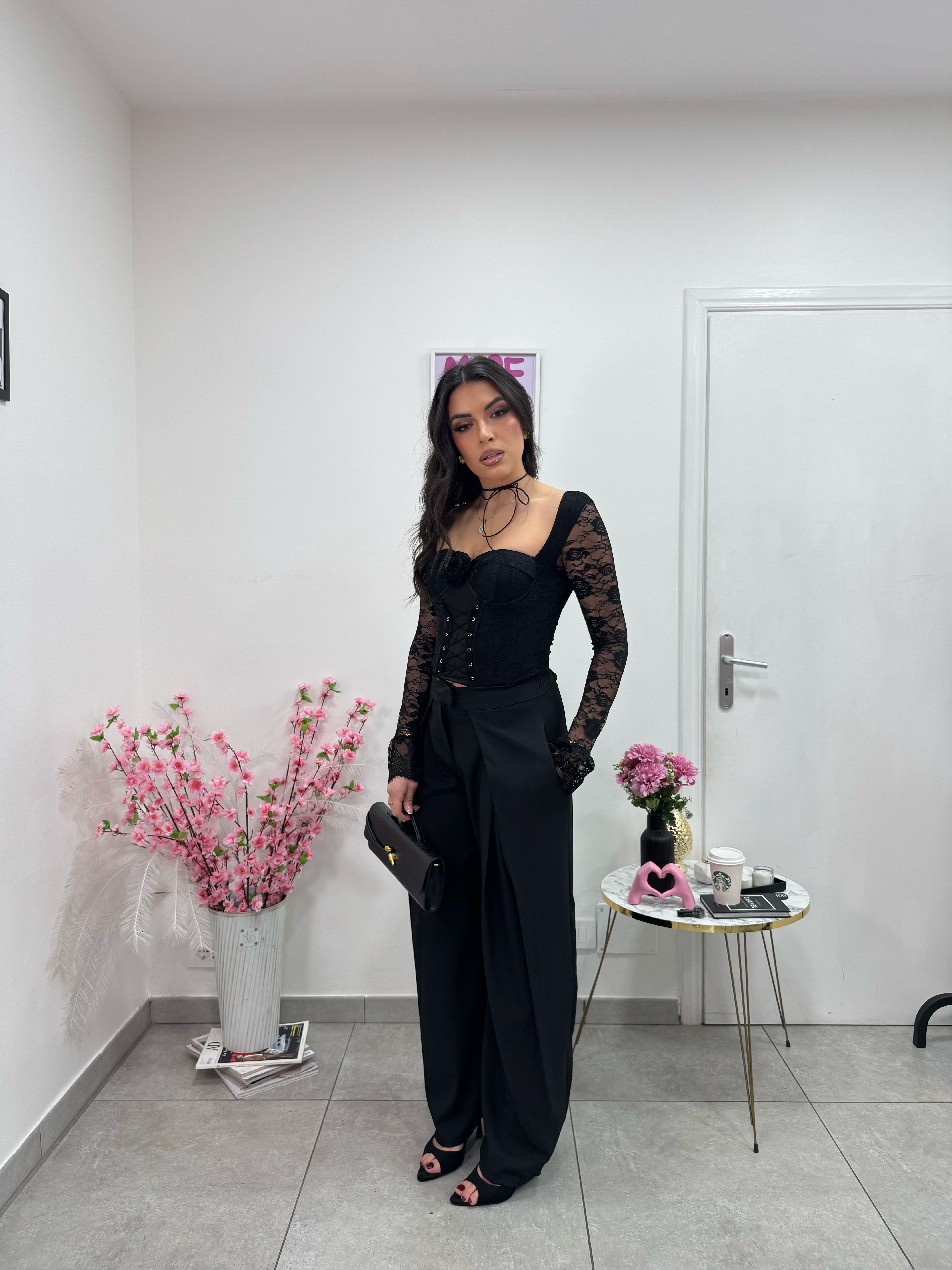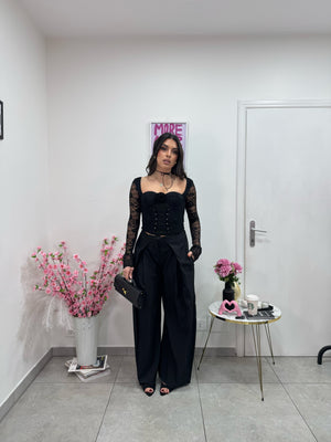 Crop top manica lunga in pizzo stringato davanti con coppe preformate e rosellina in pizzo.