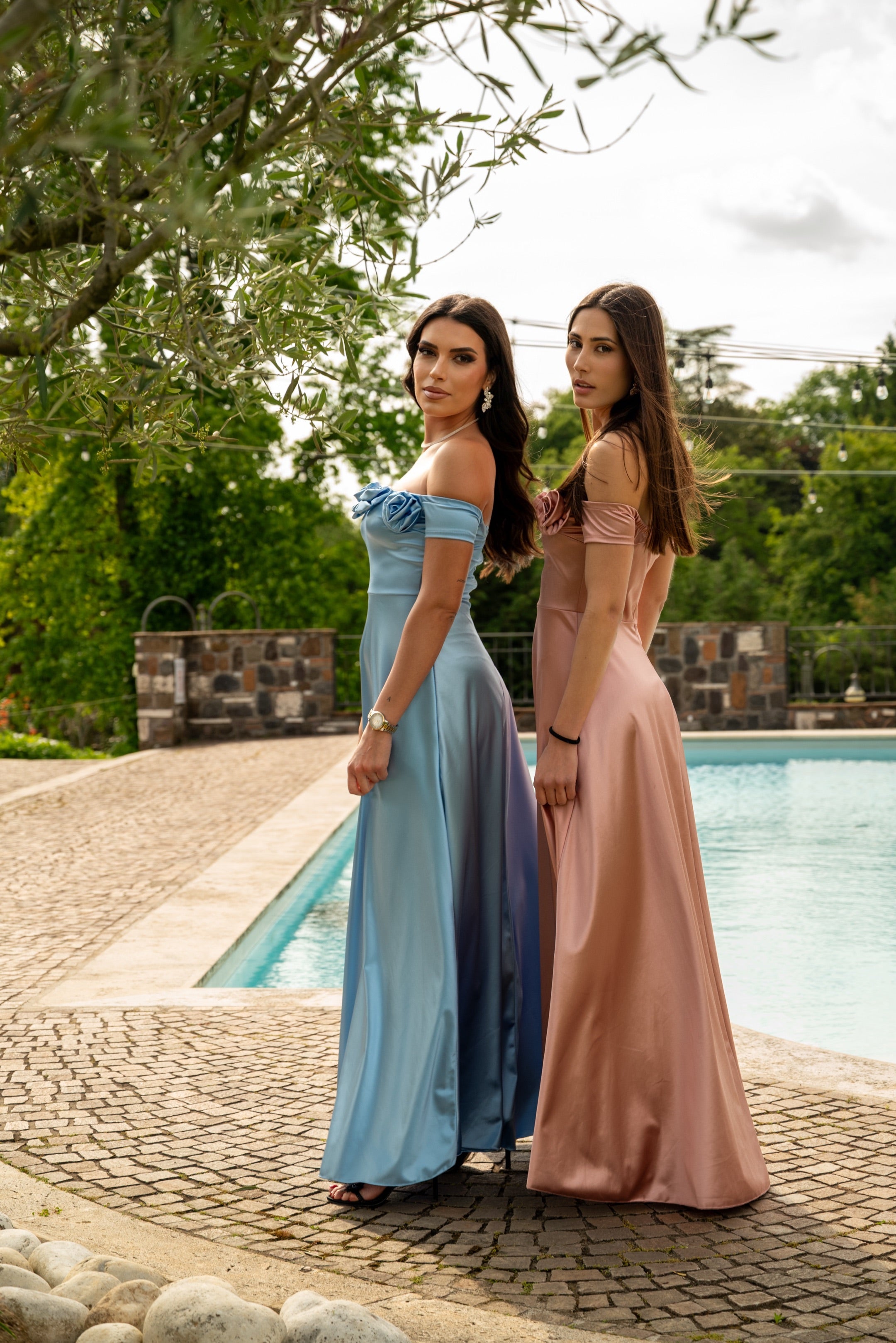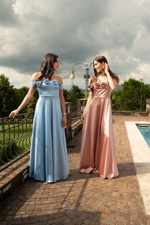 Abito lungo con scollo a barca mezza manica, applicazione rose davanti, spalline regolabili. Coppe preformate.