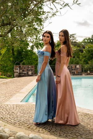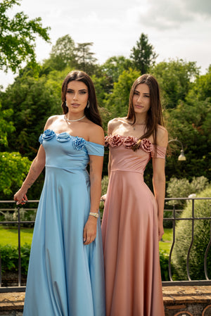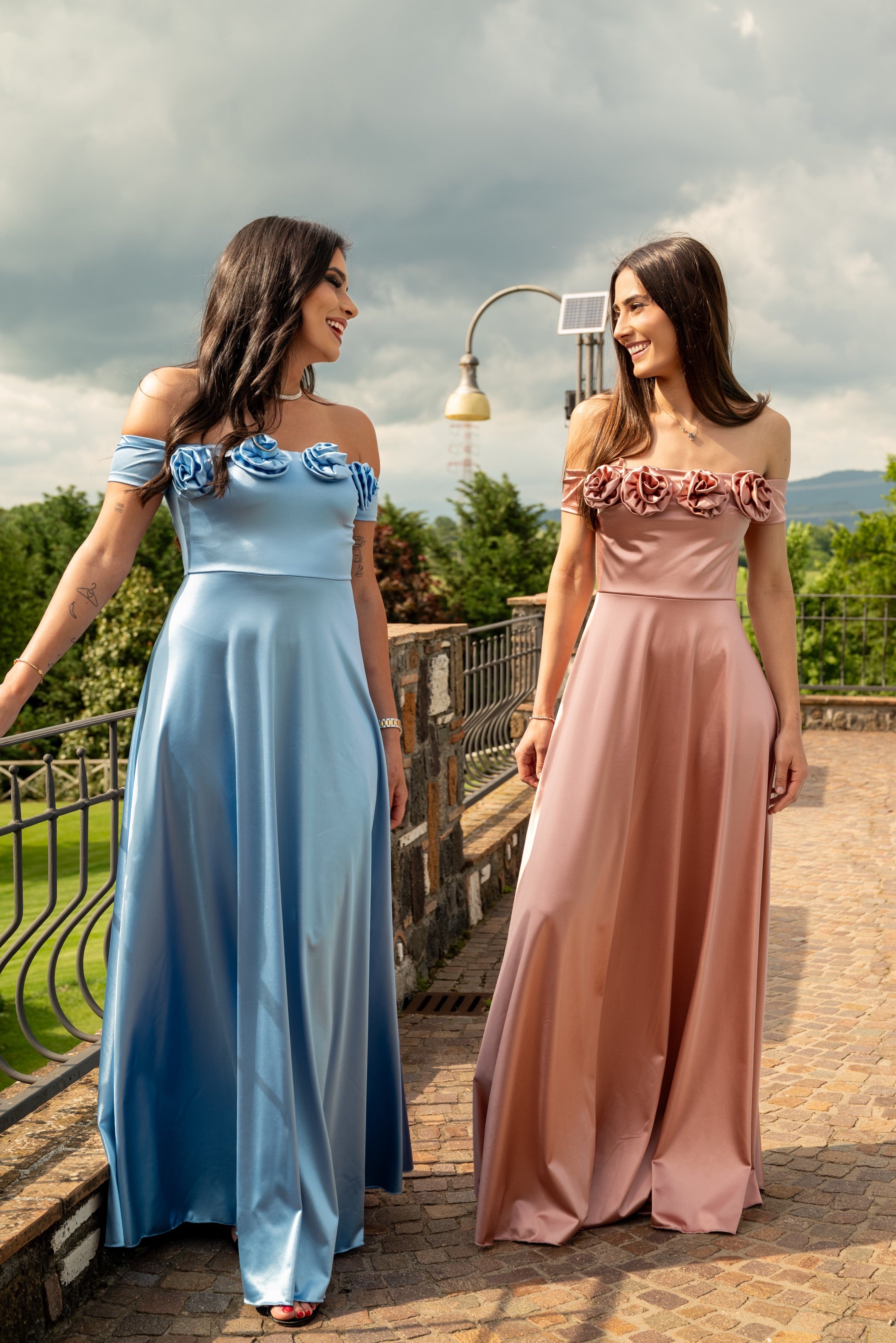 Abito lungo con scollo a barca mezza manica, applicazione rose davanti, spalline regolabili. Coppe preformate.