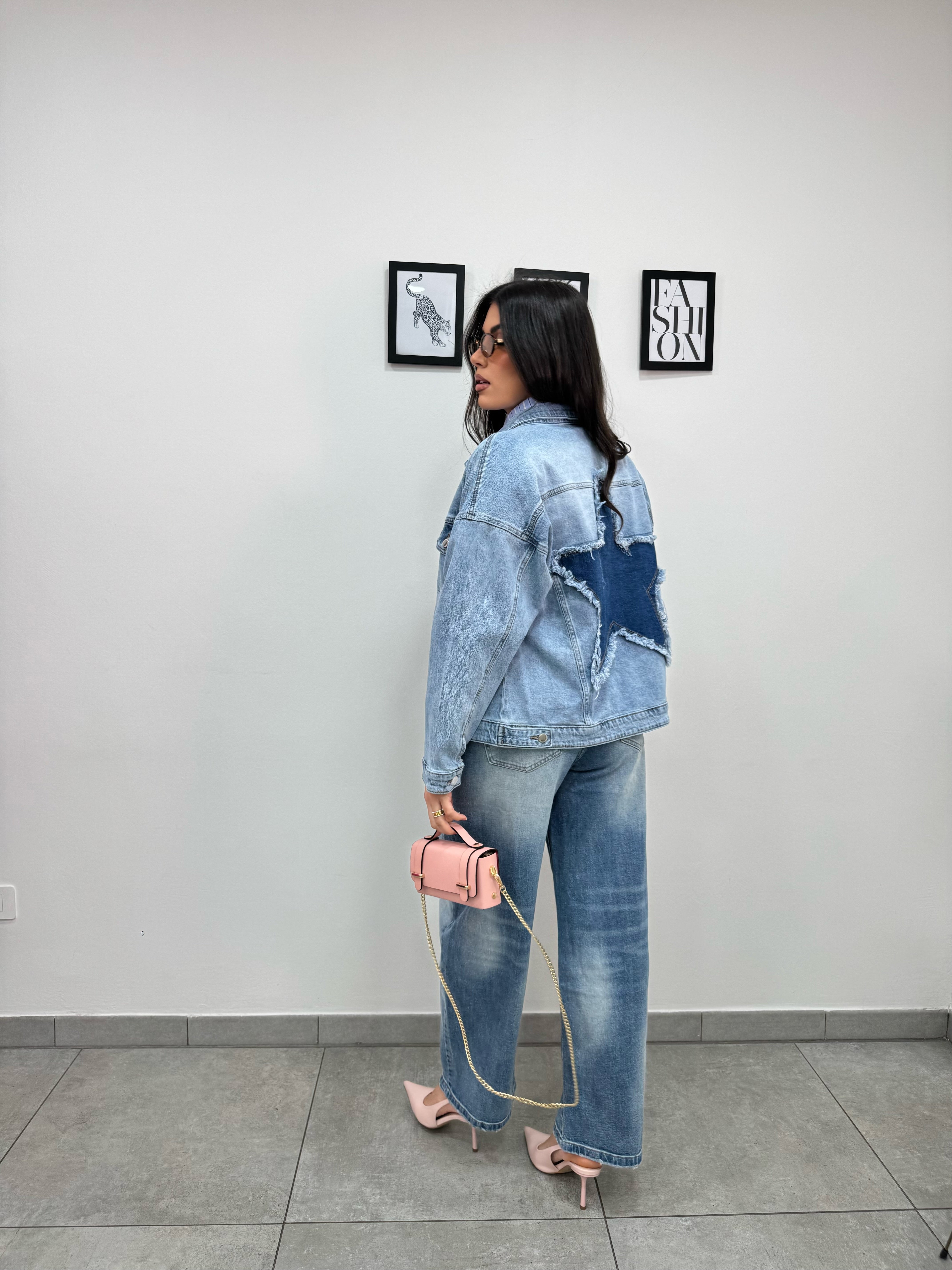 Giacca in jeans denim con toppa dietro la schiena in denim blu.