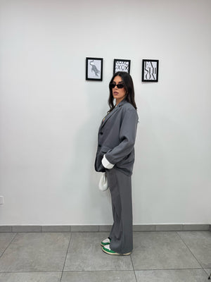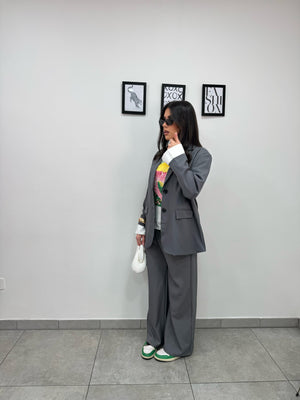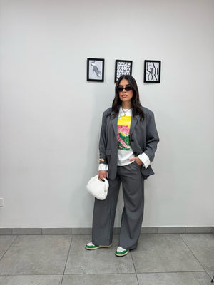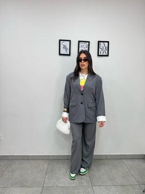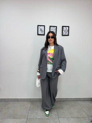 Tailleur oversize composto da blazer monopetto foderato interamente con spalline, manica con finta camicia e pantaloni palazzo con pinces, passanti ed elastico in vita.