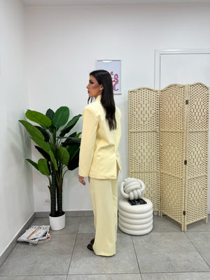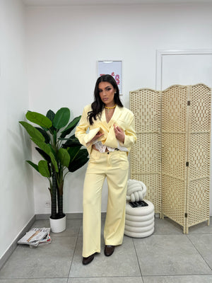 Pantalone palazzo con elastico in vita, passanti, tasche e taschino finto anteriore cucito.