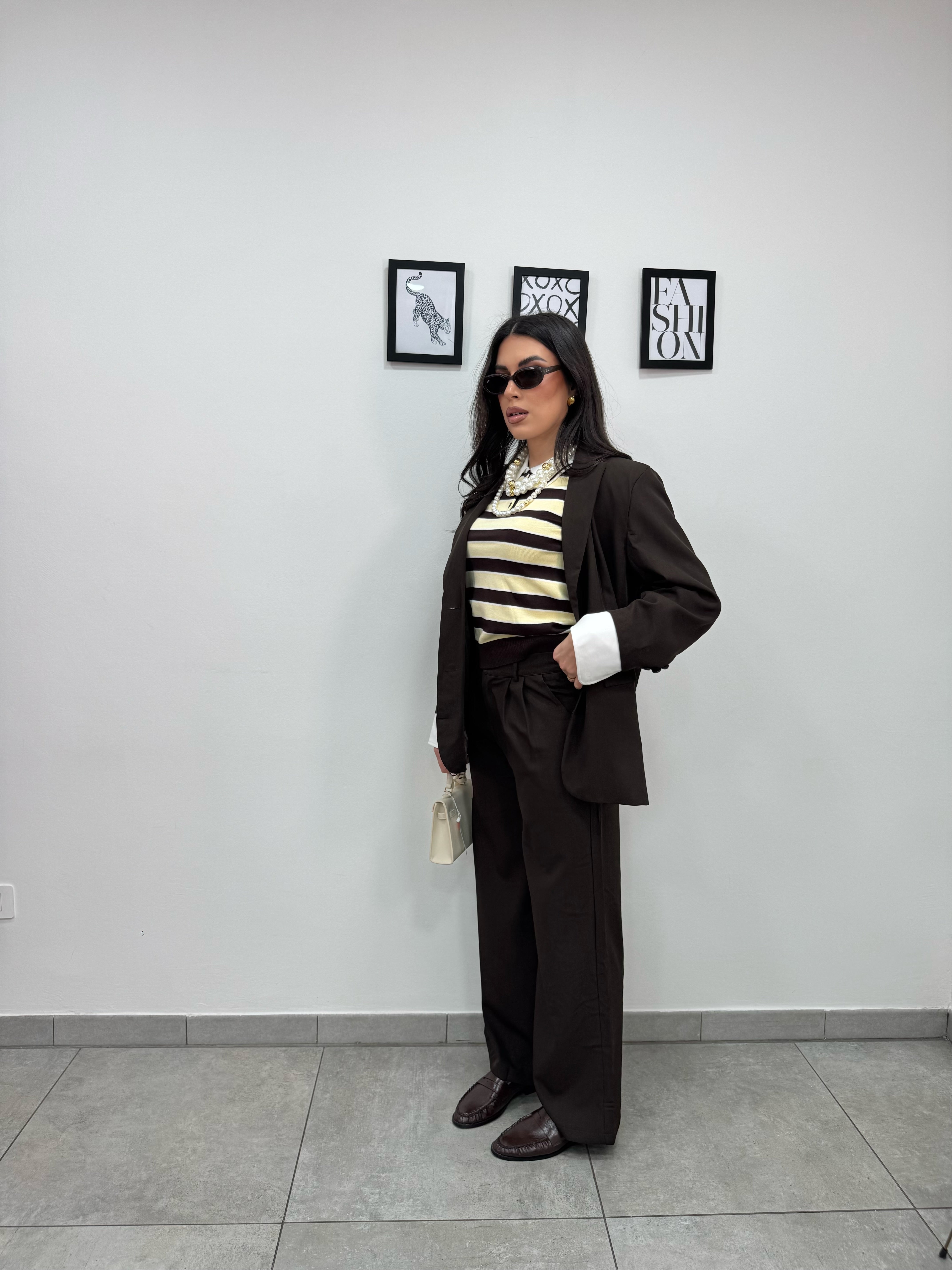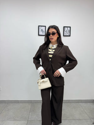 Tailleur oversize composto da blazer monopetto foderato interamente con spalline, manica con finta camicia e pantaloni palazzo con pinces, passanti ed elastico in vita.