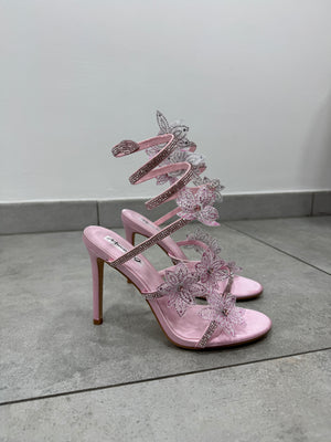 Sandali con tacco alto a spirale con applicazione fiori.