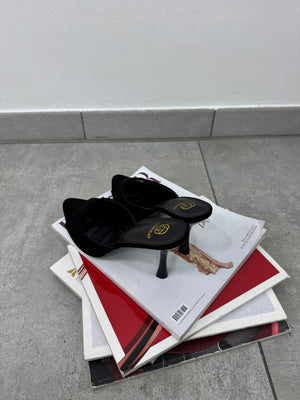 Sandali sabot aperto con tacco scamosciato.