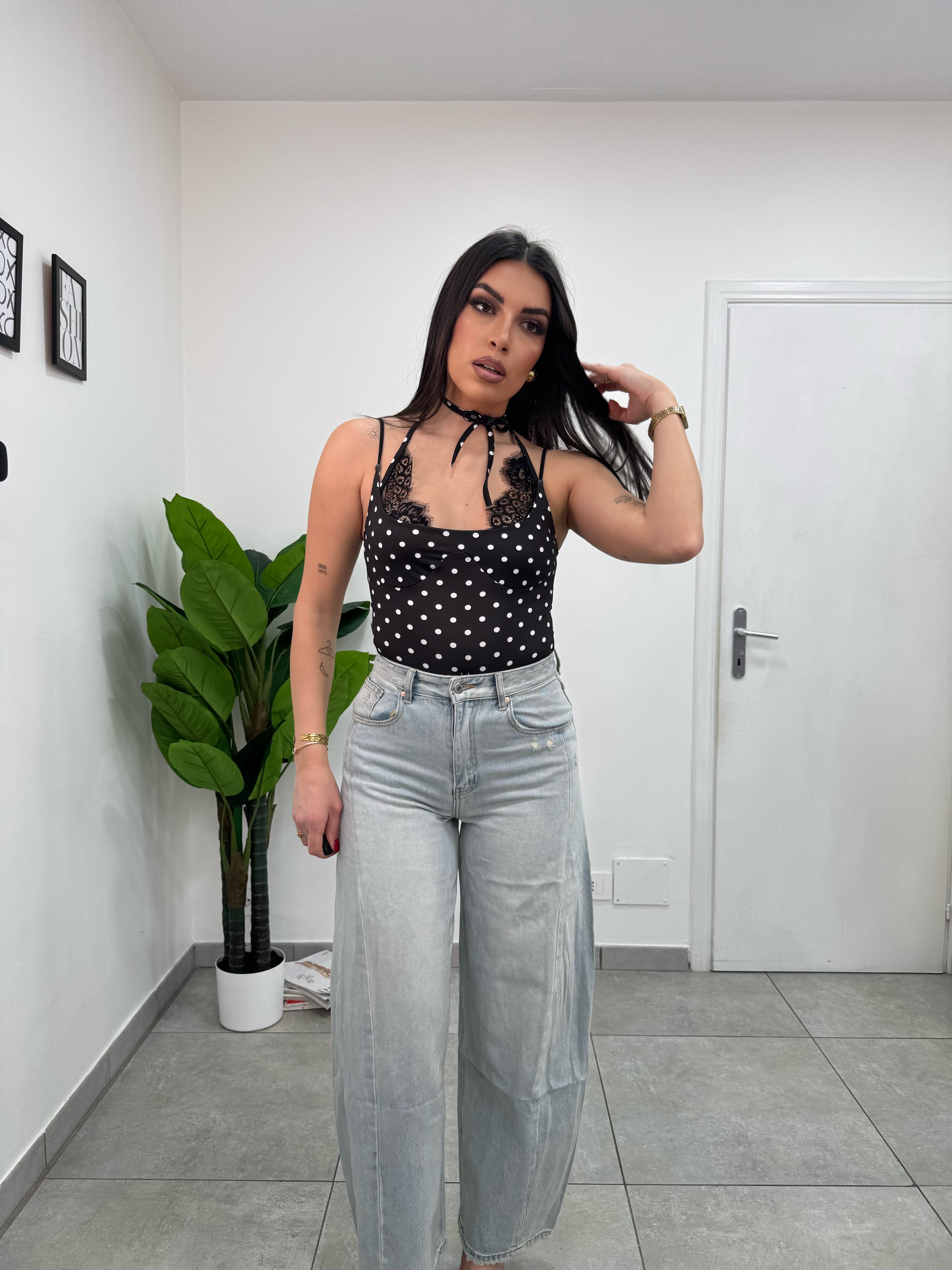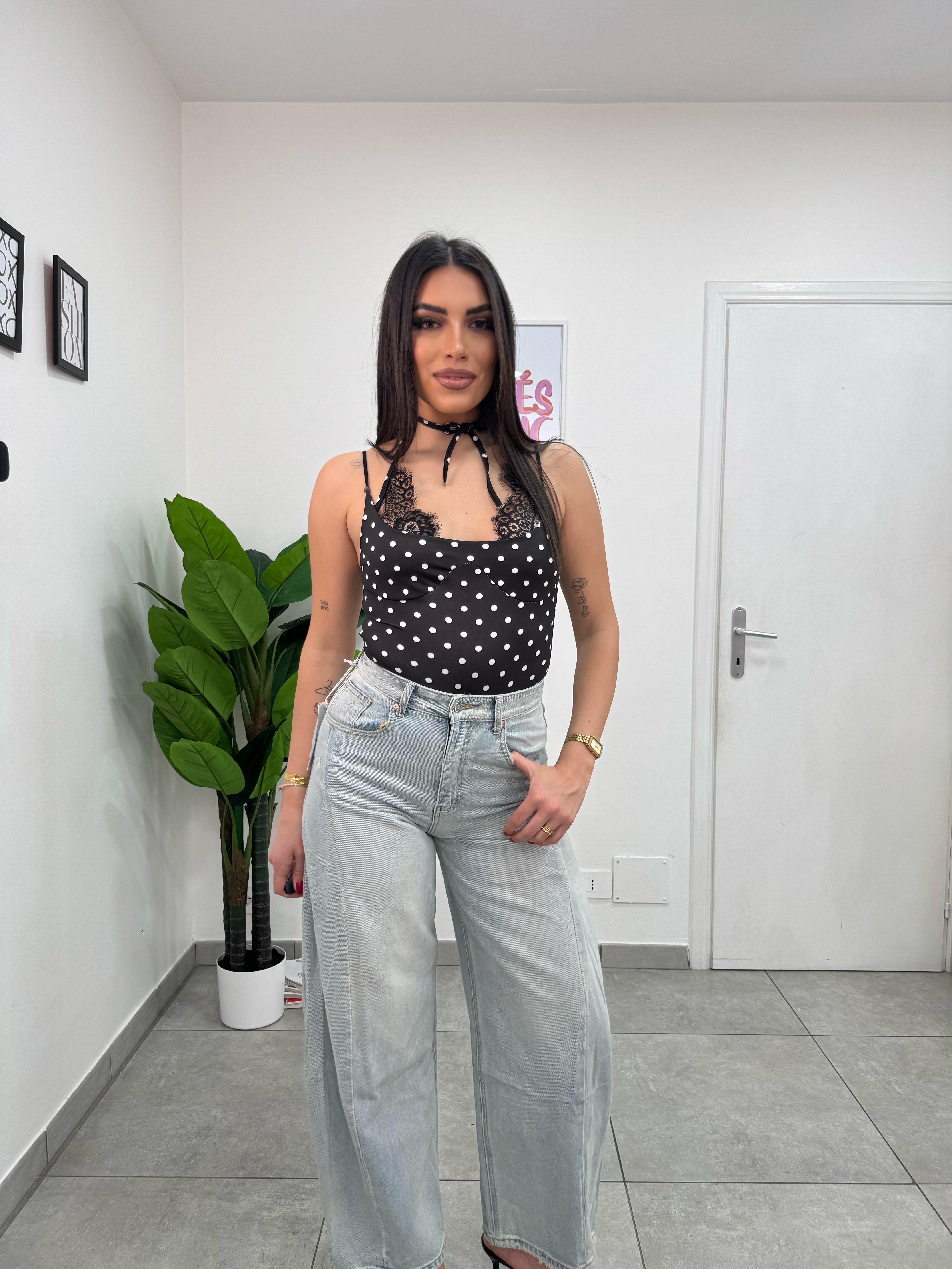 Body a pois con dettaglio pizzo legato intorno al collo, bretelline elastica.