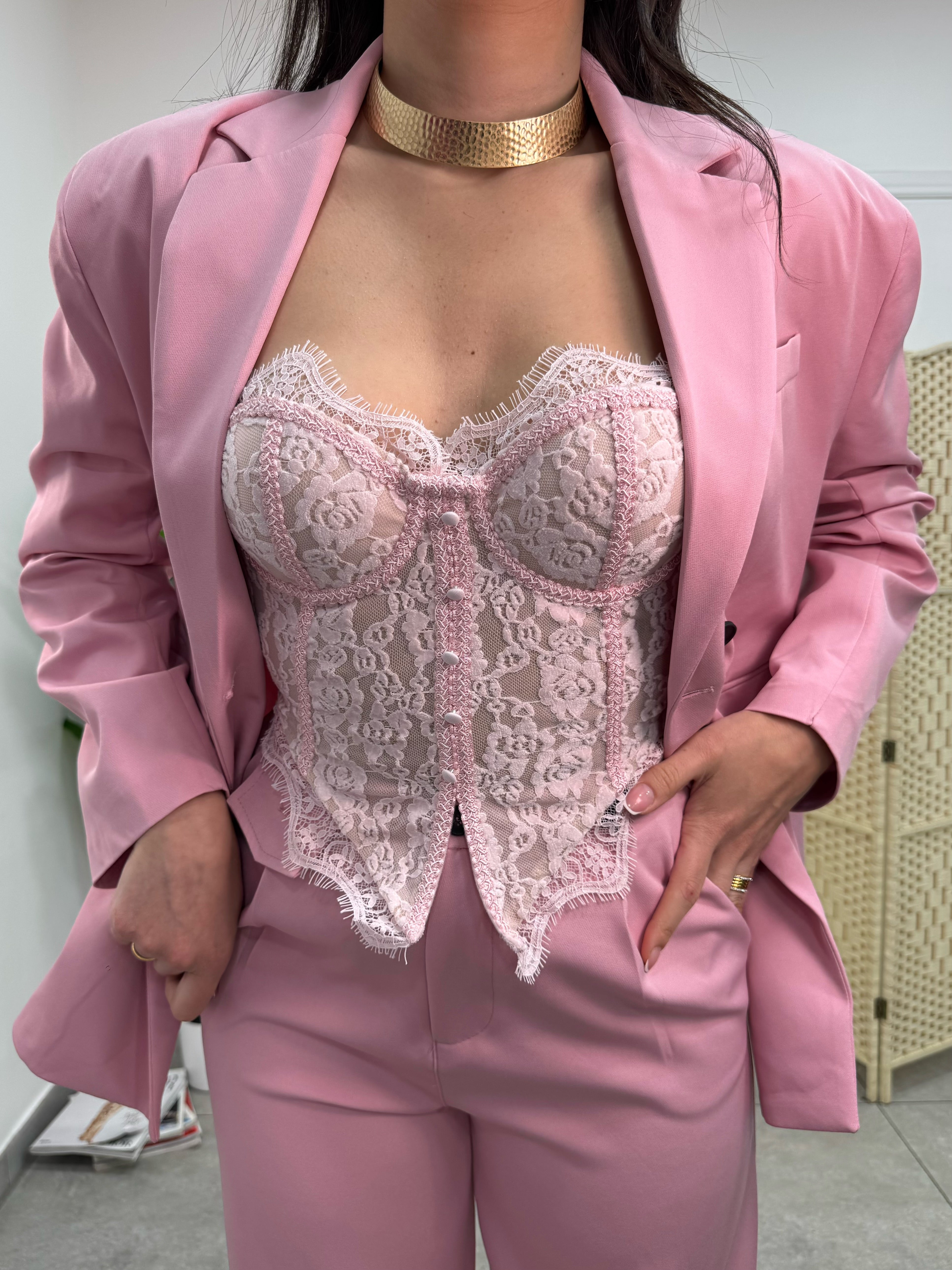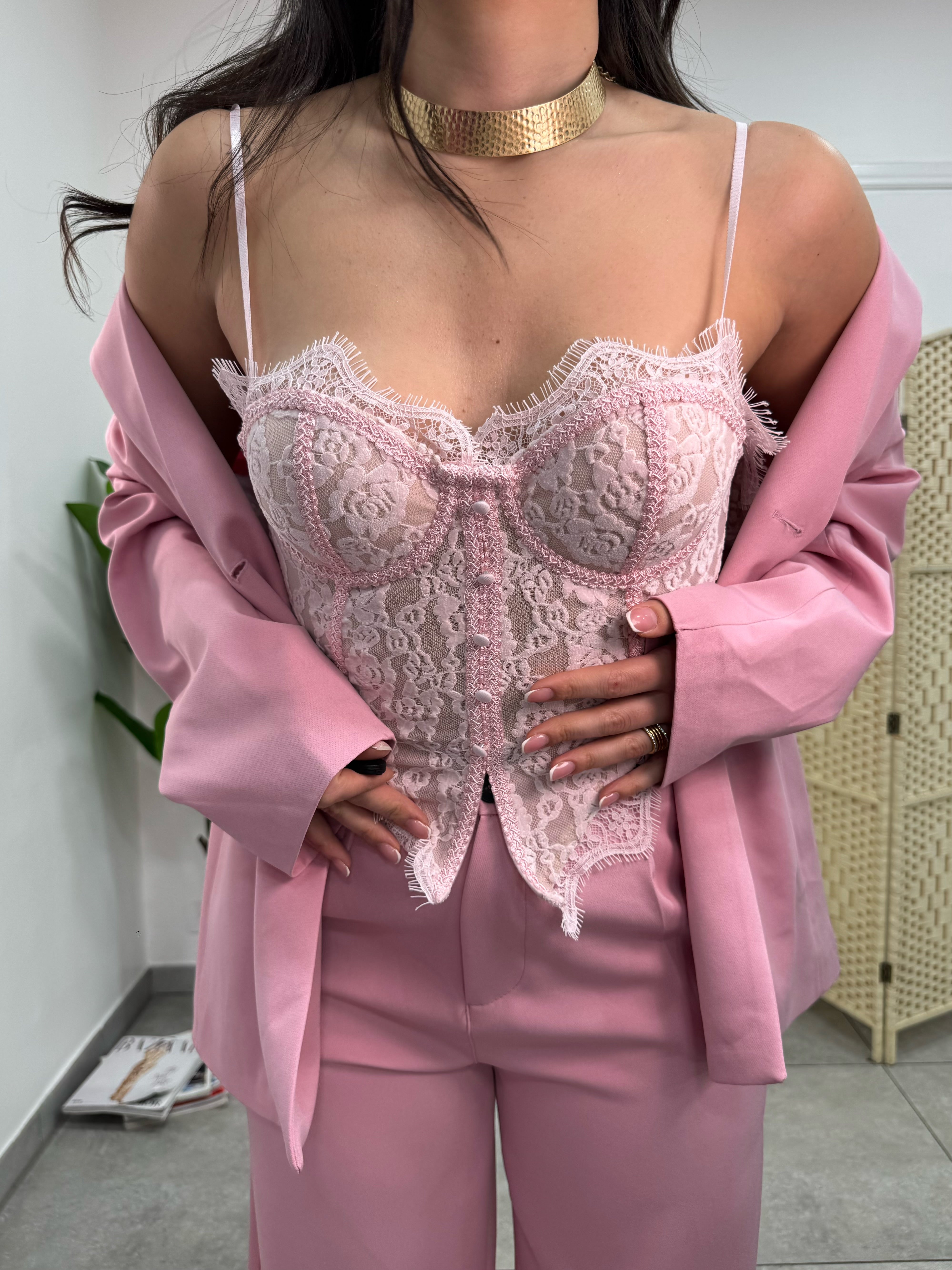 Corsetto ricoperto di pizzo e velluto con bottoni finti anteriori, spalline regolabili e rimovibili e zip posteriore.