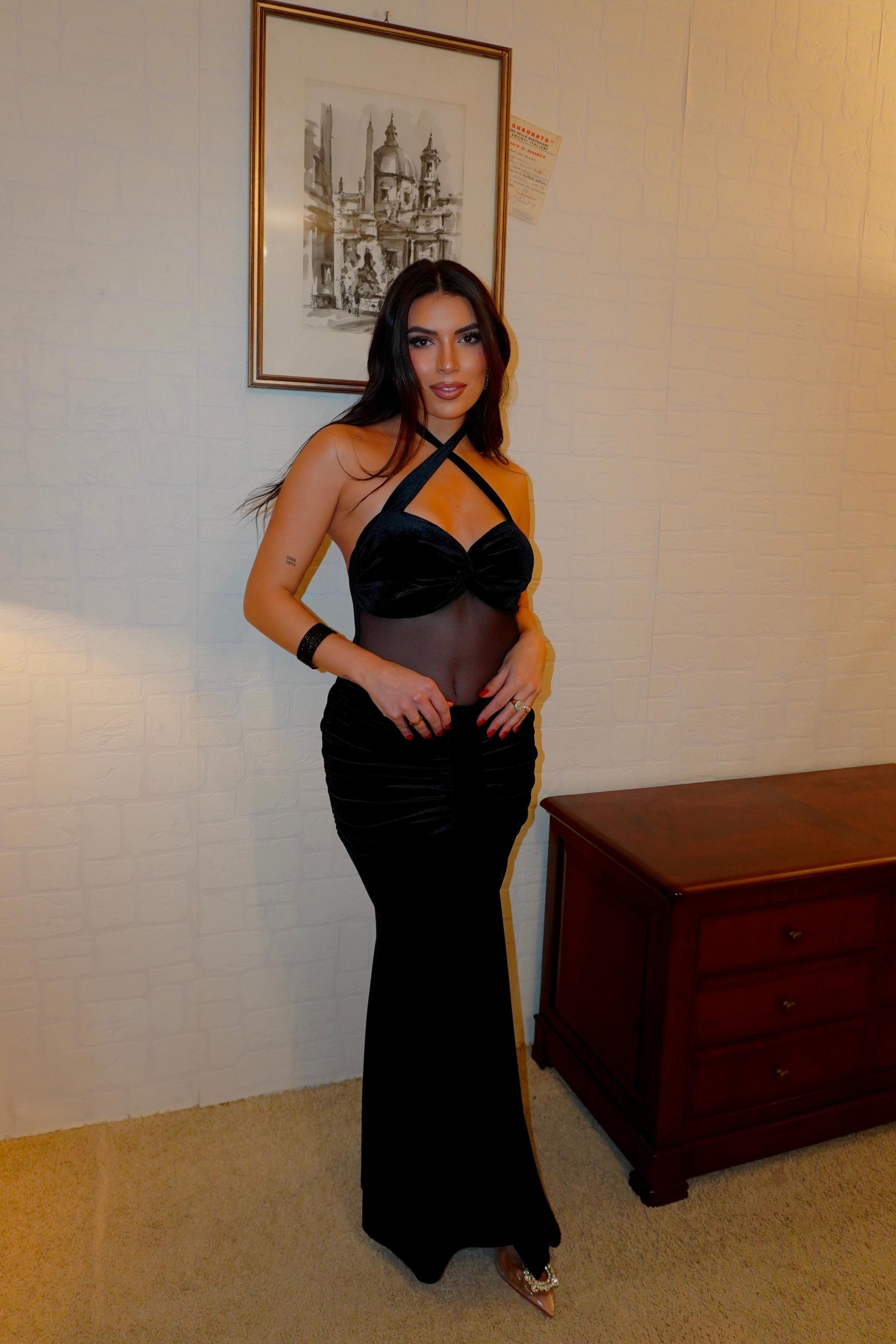 Abito in velluto lungo con coppe interne, fiocco dietro al collo, fusciacca anteriore e tull trasparente sulla vita.