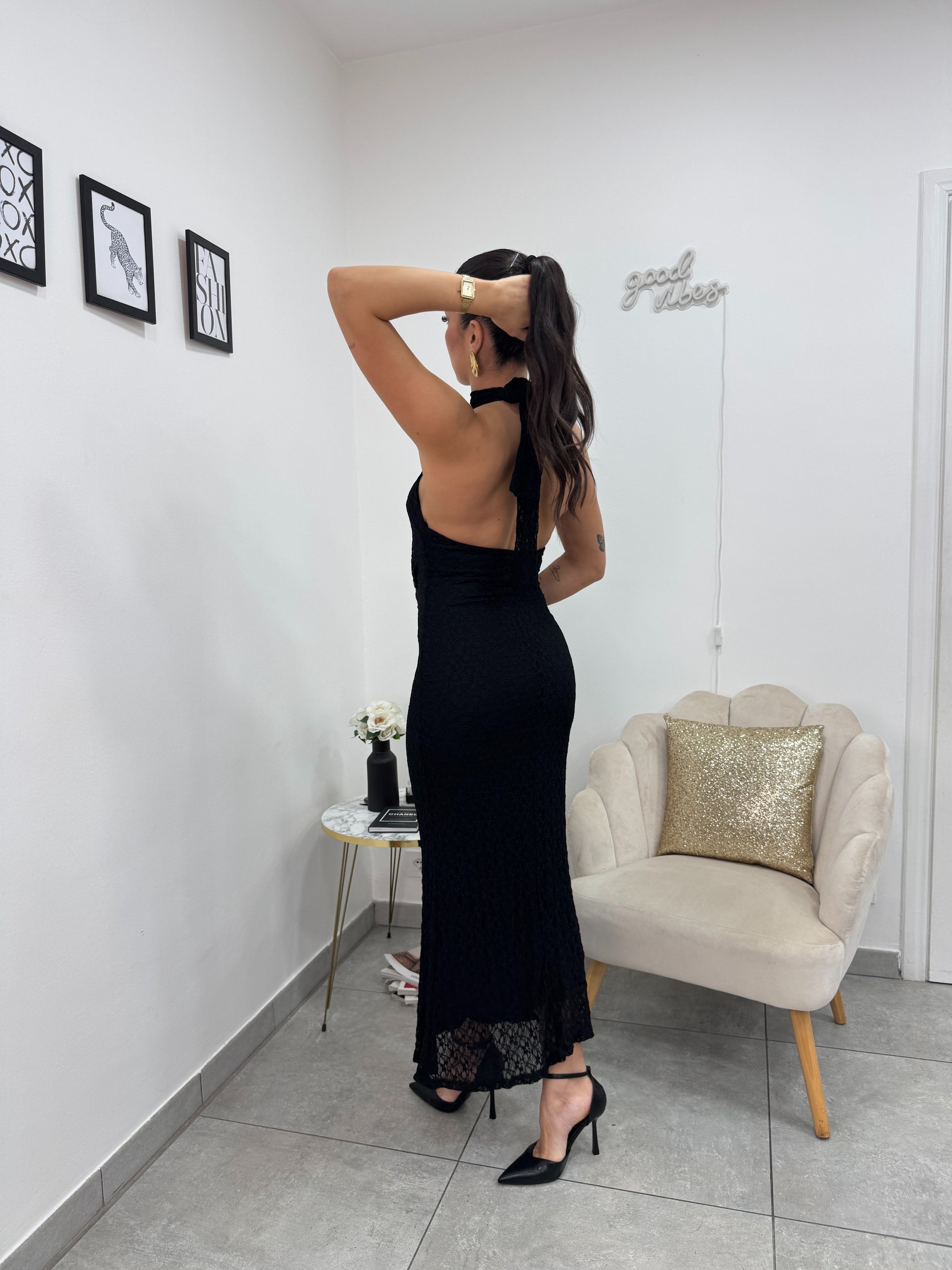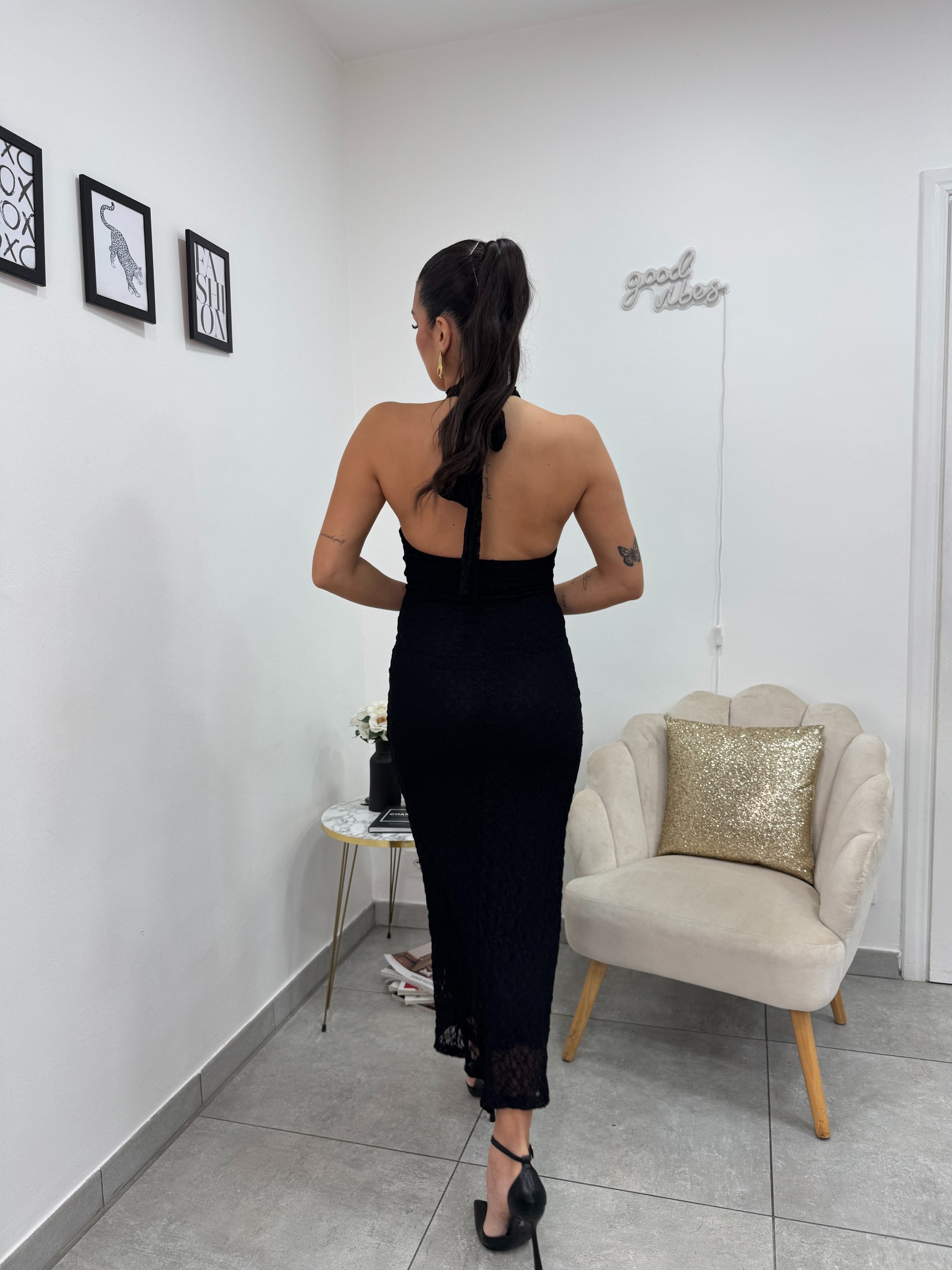 Abito lungo in pizzo con fiocco dietro al collo, schiena scoperta e dettaglio nodo in vita.
