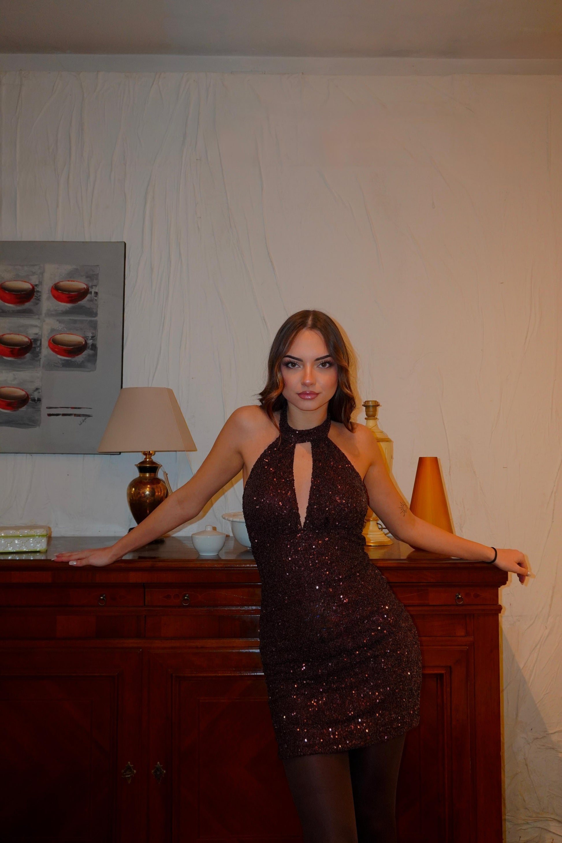Mini abito ricoperto di paillettes con scollo all’americana, fodera interna, coppe preformate, schiena scoperta e bottoni dietro al collo.