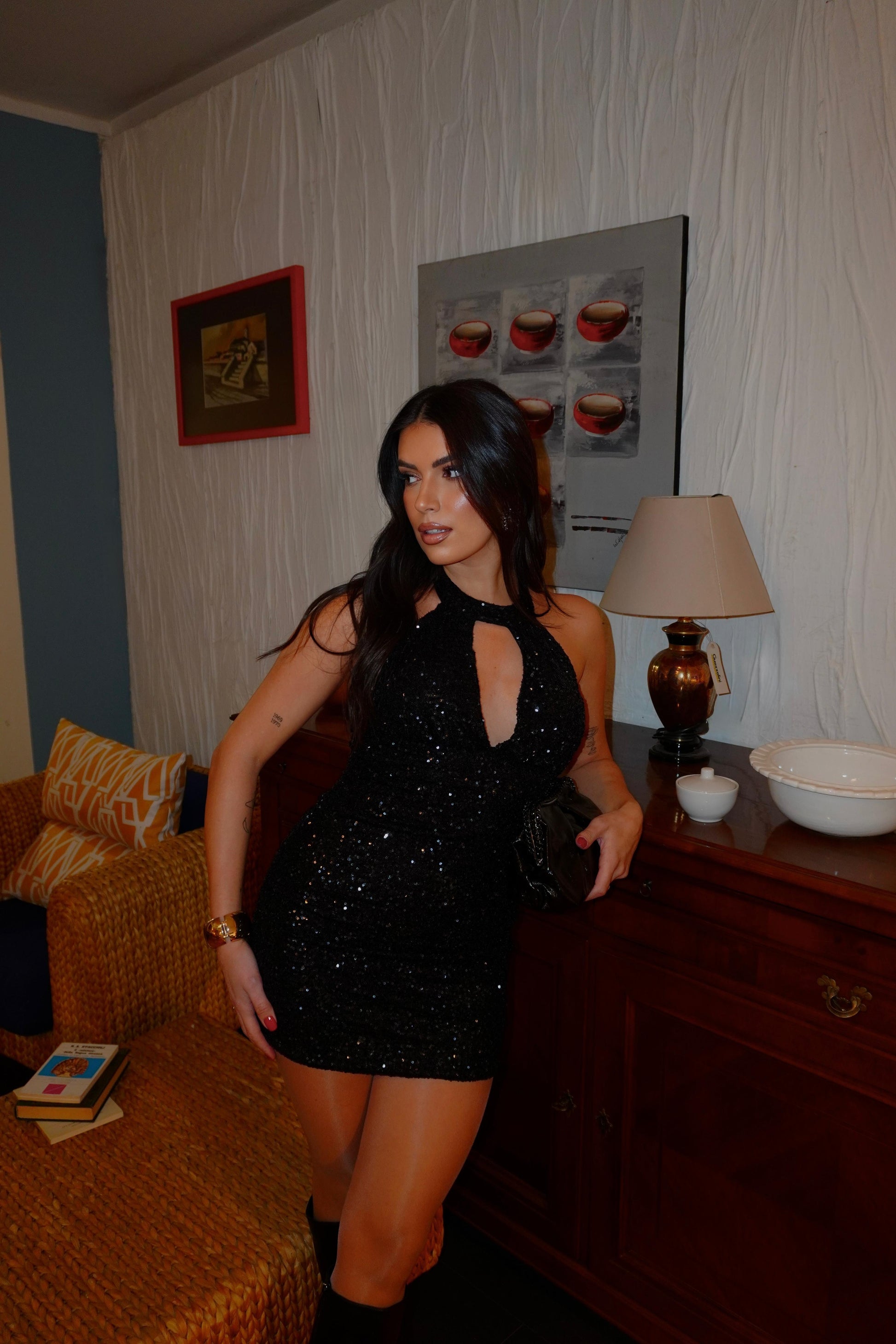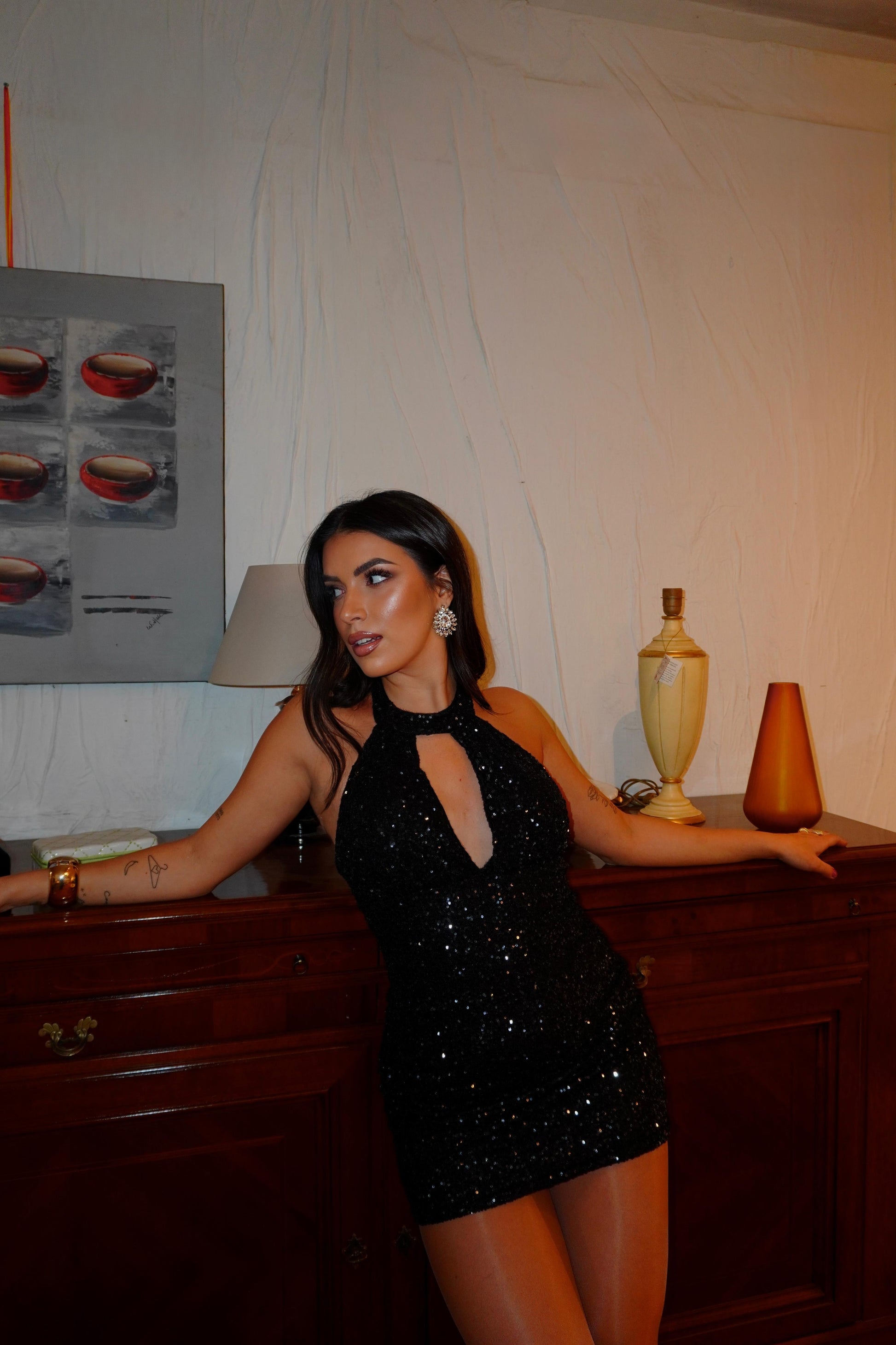 Mini abito ricoperto di paillettes con scollo all’americana, fodera interna, coppe preformate, schiena scoperta e bottoni dietro al collo.