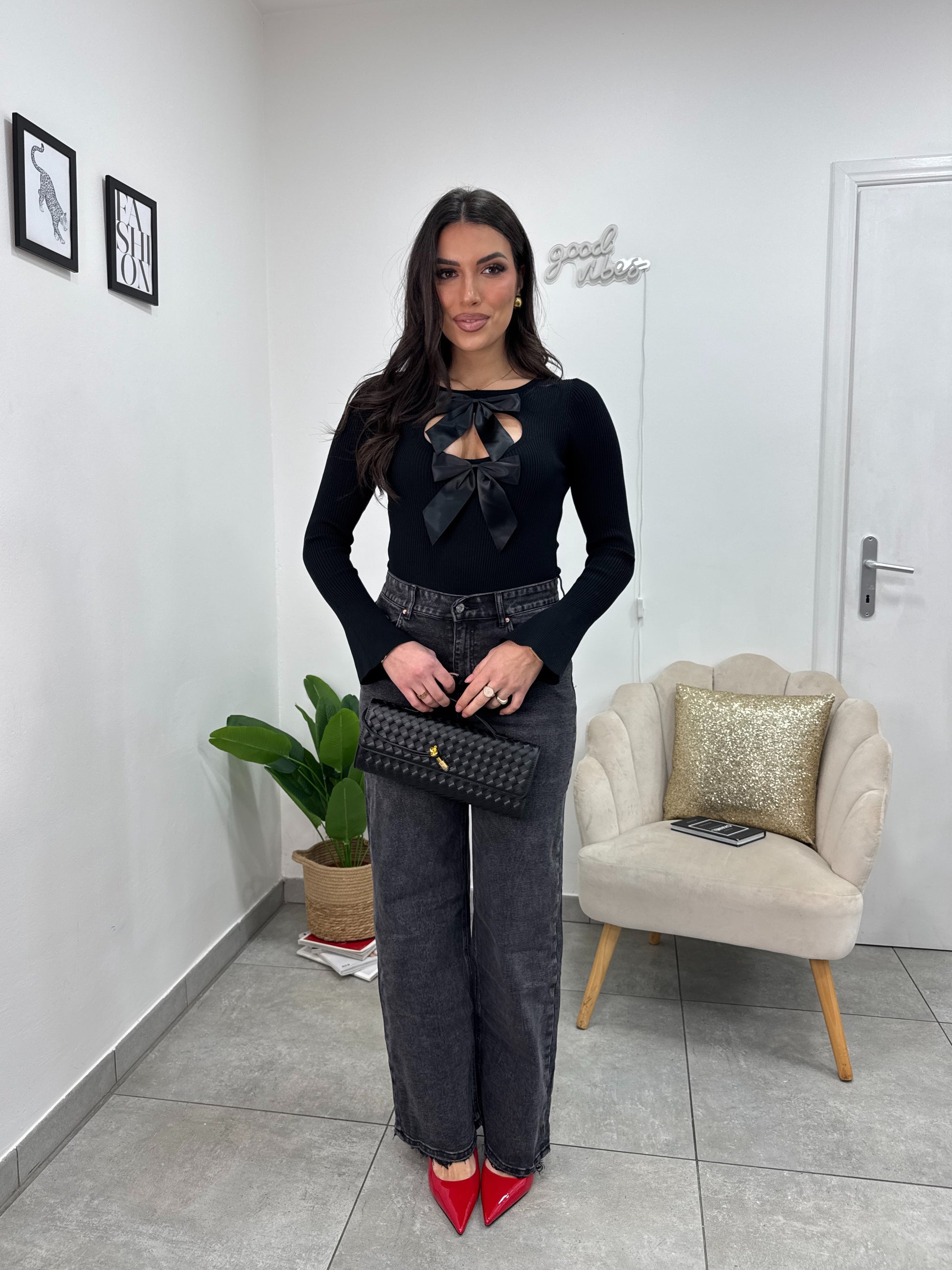 Body a costine girocollo con oblò e spille fiocco raso rimovibili. Manica a campana.