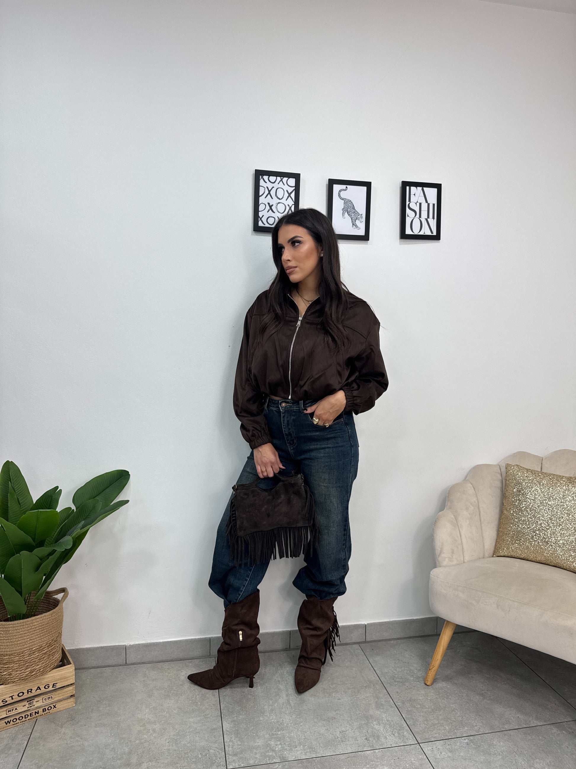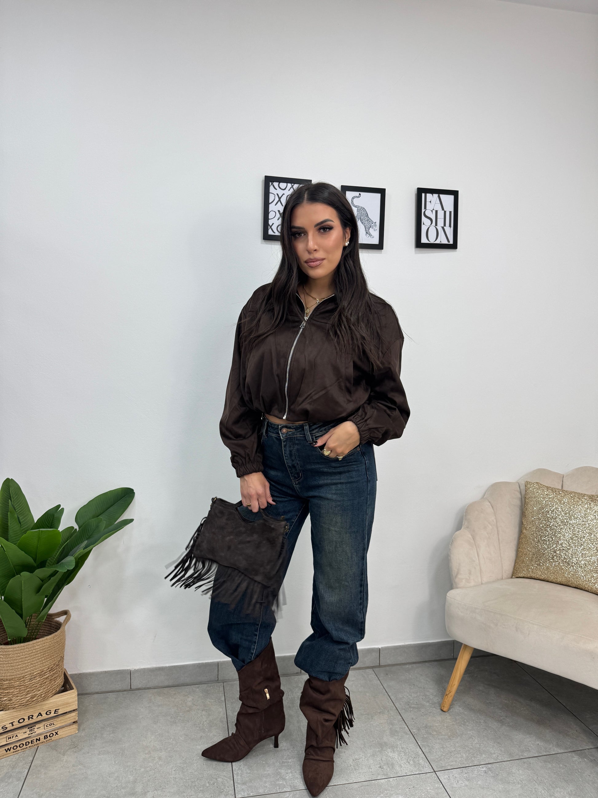Bomber scamosciato marrone con chiusura zip, maniche a palloncino, con elastico in vita regolabile, foderato internamente.