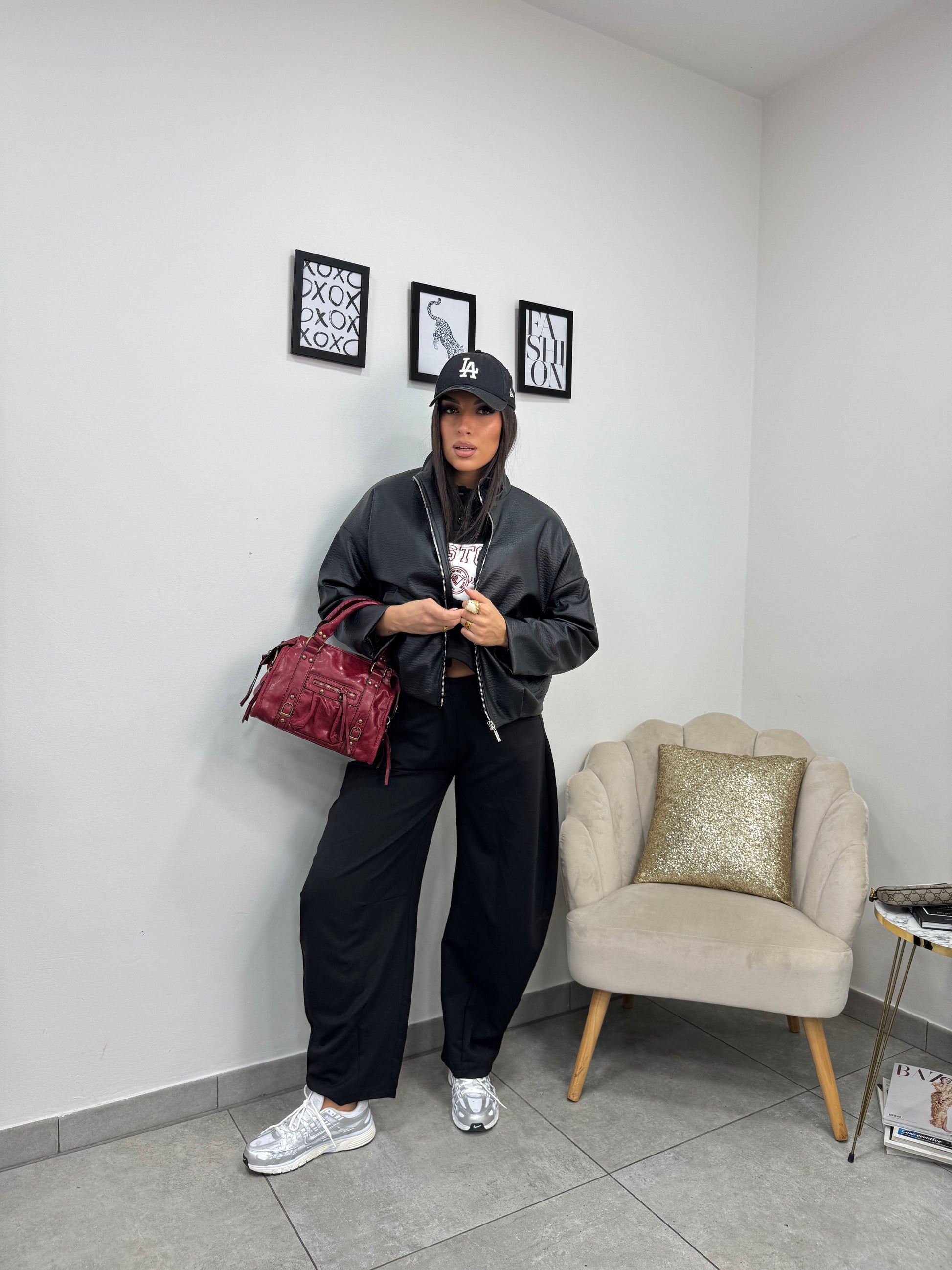 Bomber ecopelle martellata con chiusura lampo, elastico in vita, tasche. Foderato internamente.