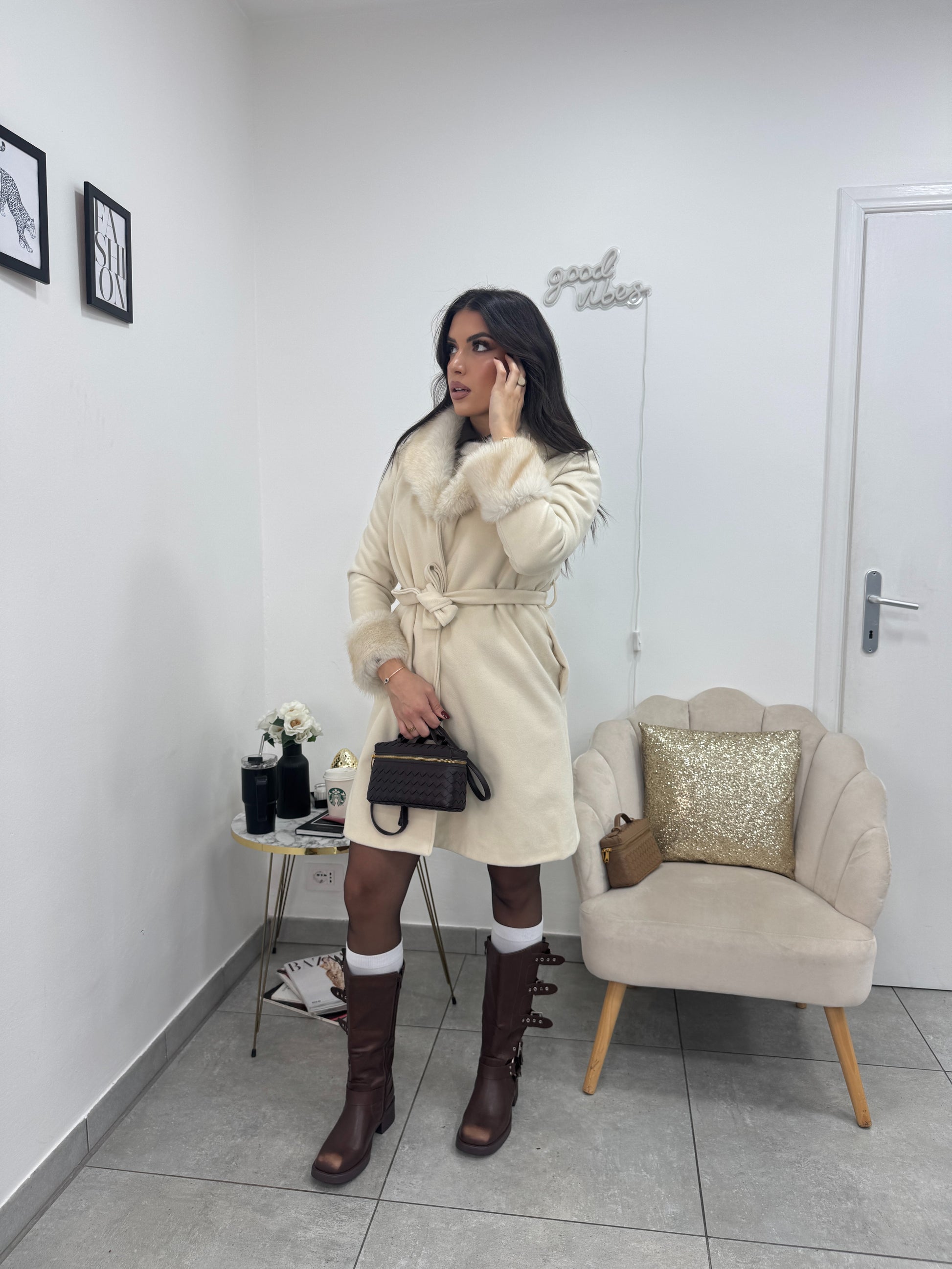 Cappotto con collo e manica eco pelliccia, monopetto con cintura in vita, foderato interamente, con spalline.