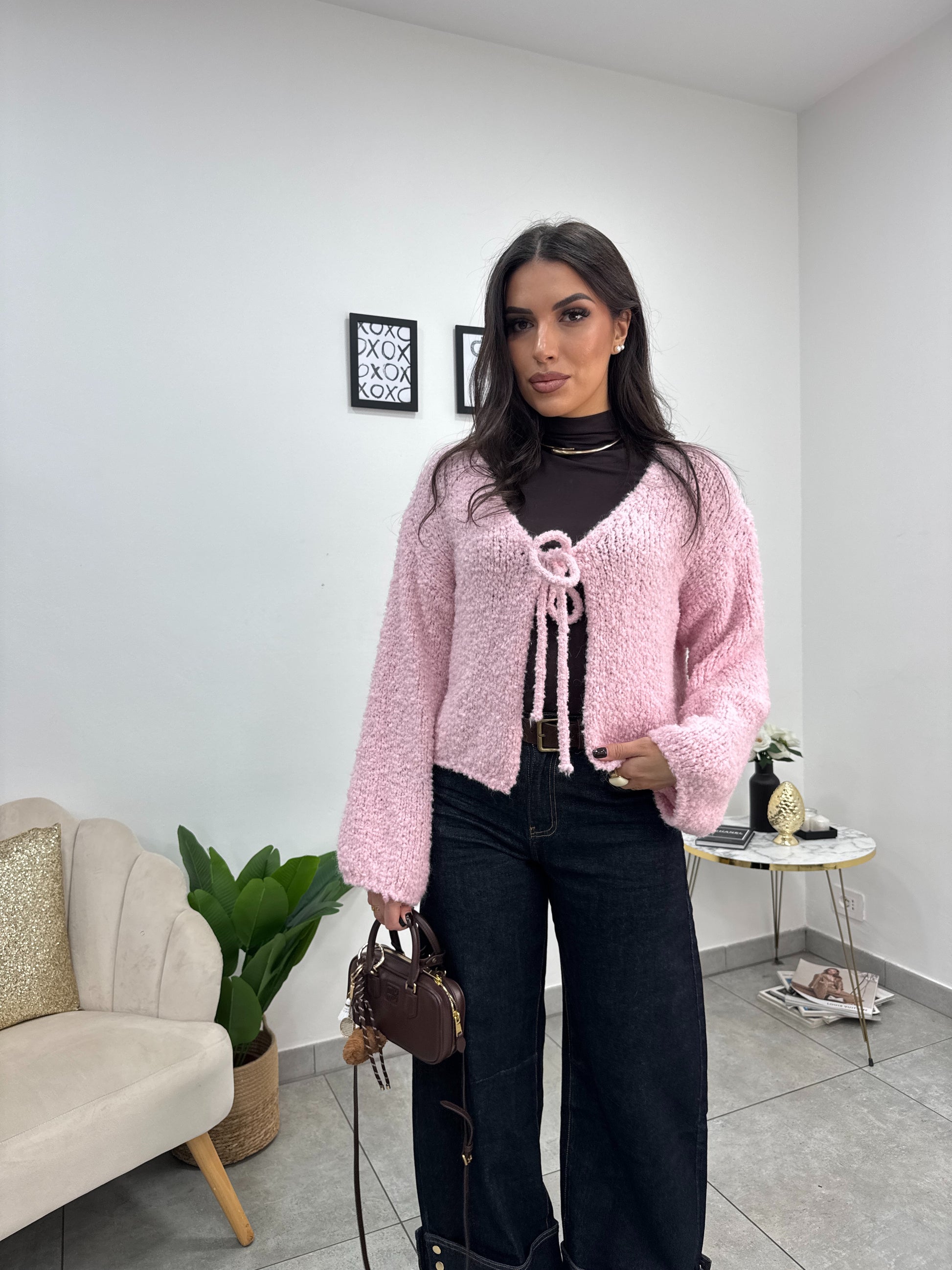 Cardigan bouclé con manica ampia e chiusura fiocco.