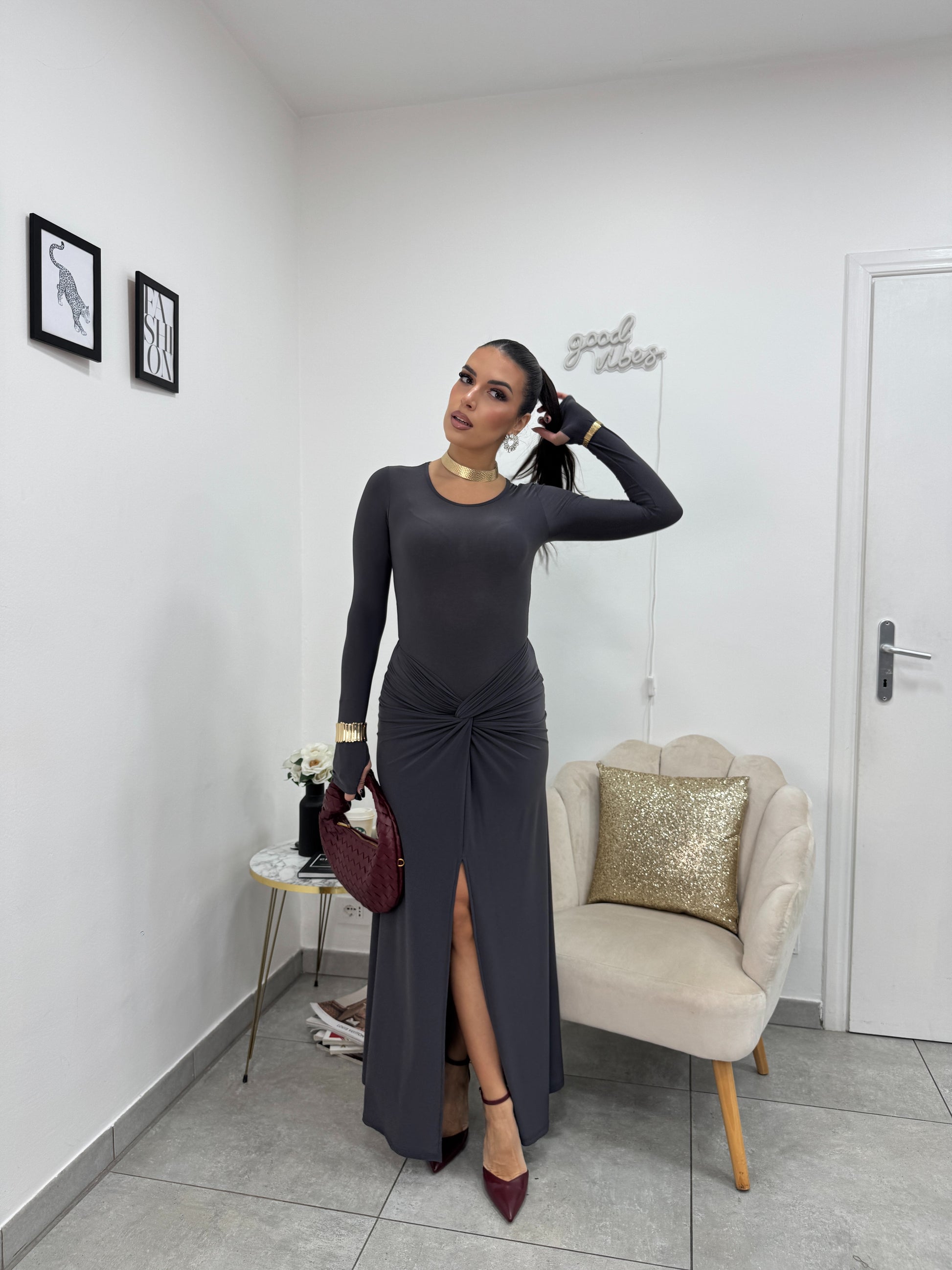 Body girocollo con maniche a guanto e gonna lunga con dettaglio nodo anteriore e arricciatura posteriore.