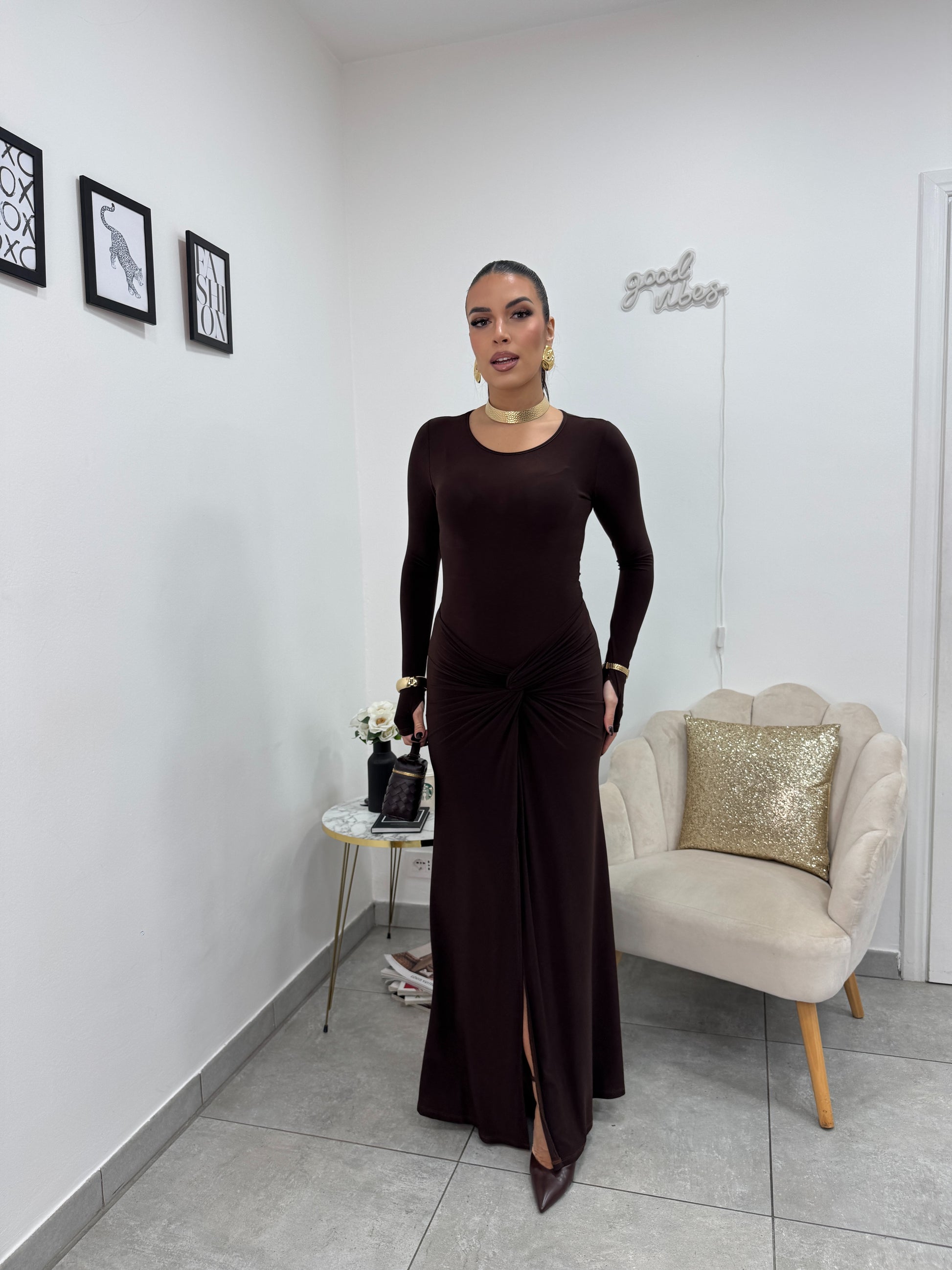 Body girocollo con maniche a guanto e gonna lunga con dettaglio nodo anteriore e arricciatura posteriore.