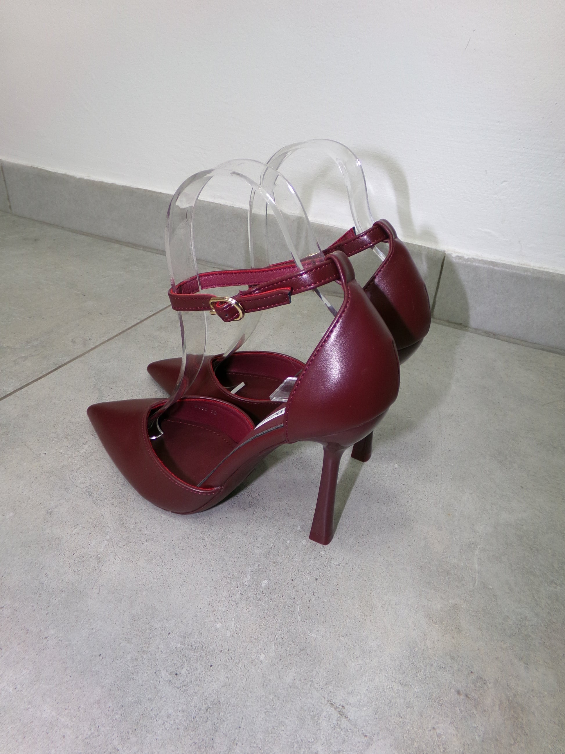 Décolleté ecopelle con cinturino regolabile e fibbia oro. Tacco circa 8 cm.