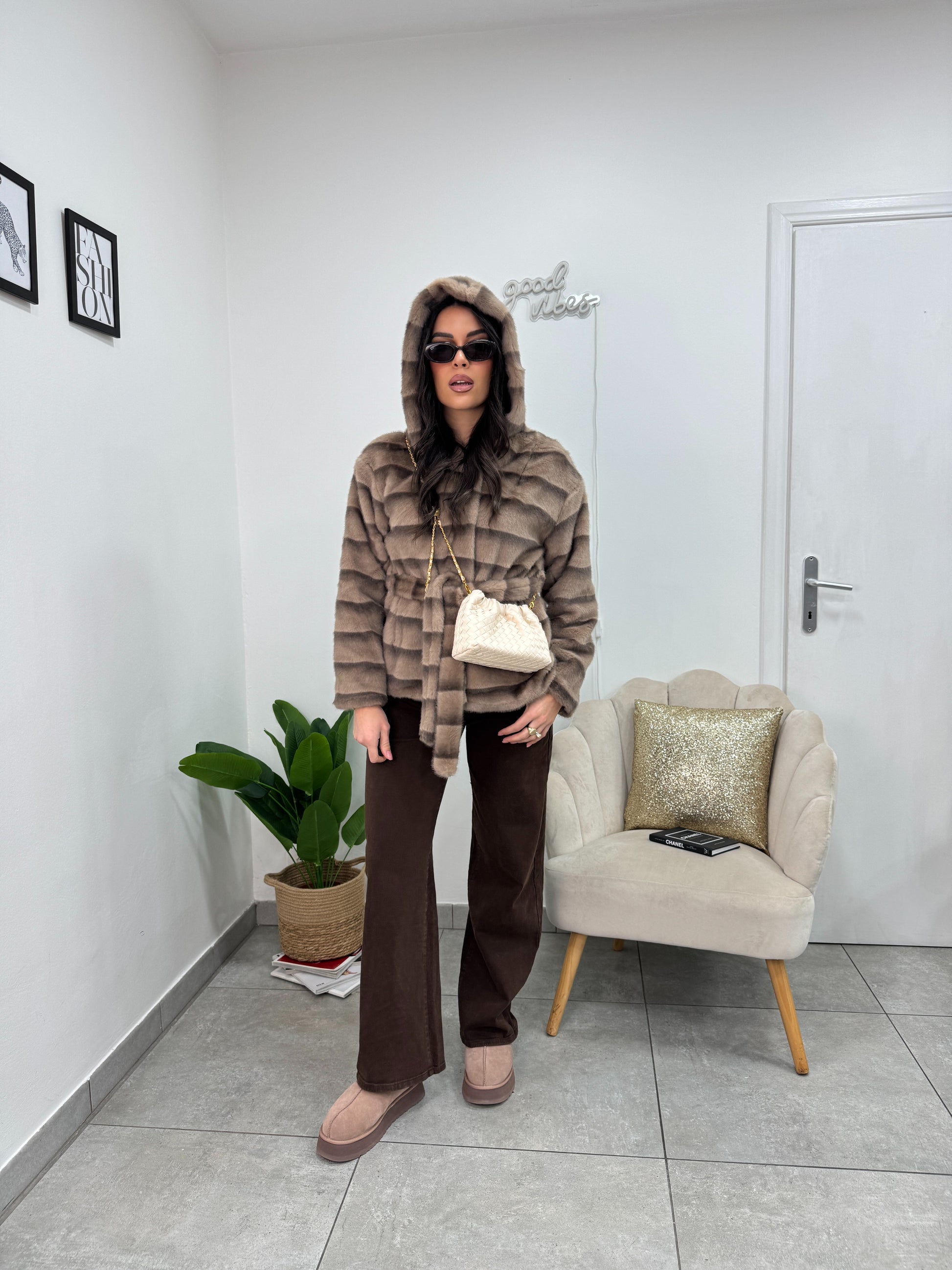 Ecopelliccia sfumata con cappuccio, tasche, bottoni e cintura.