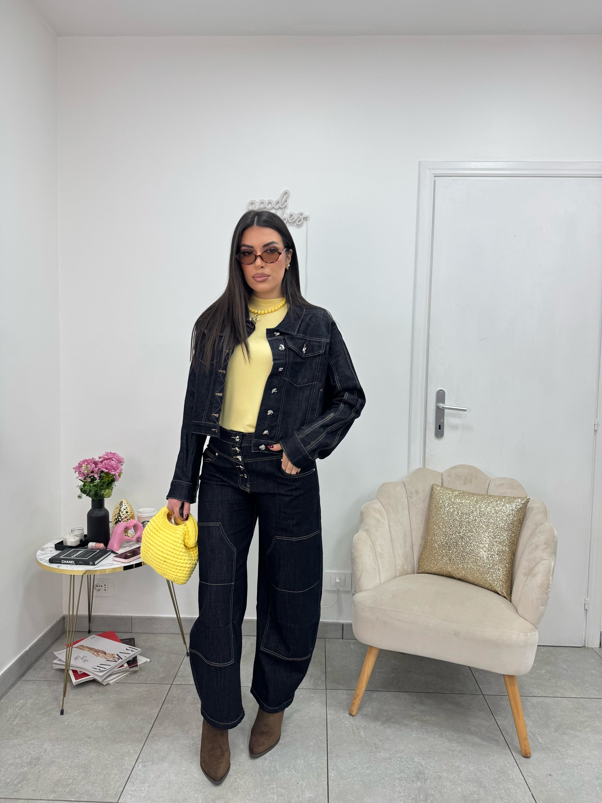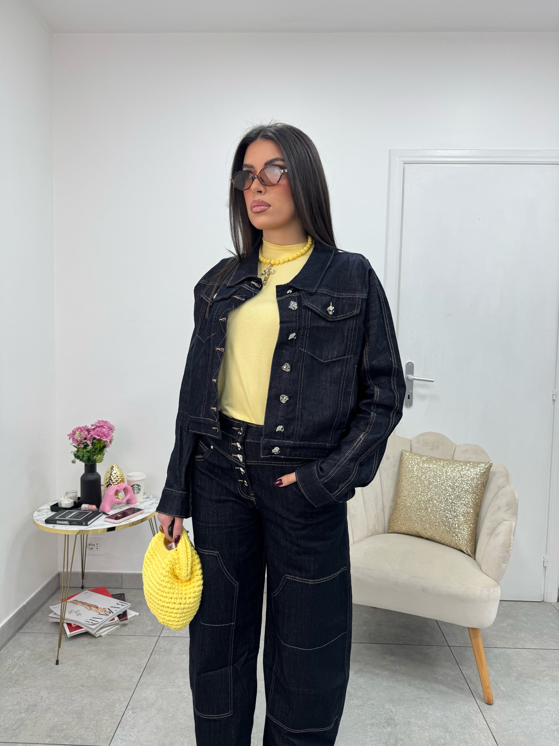 Giacca di jeans blu scura con bottoni gioiello argento, tasche anteriori e cuciture beige.