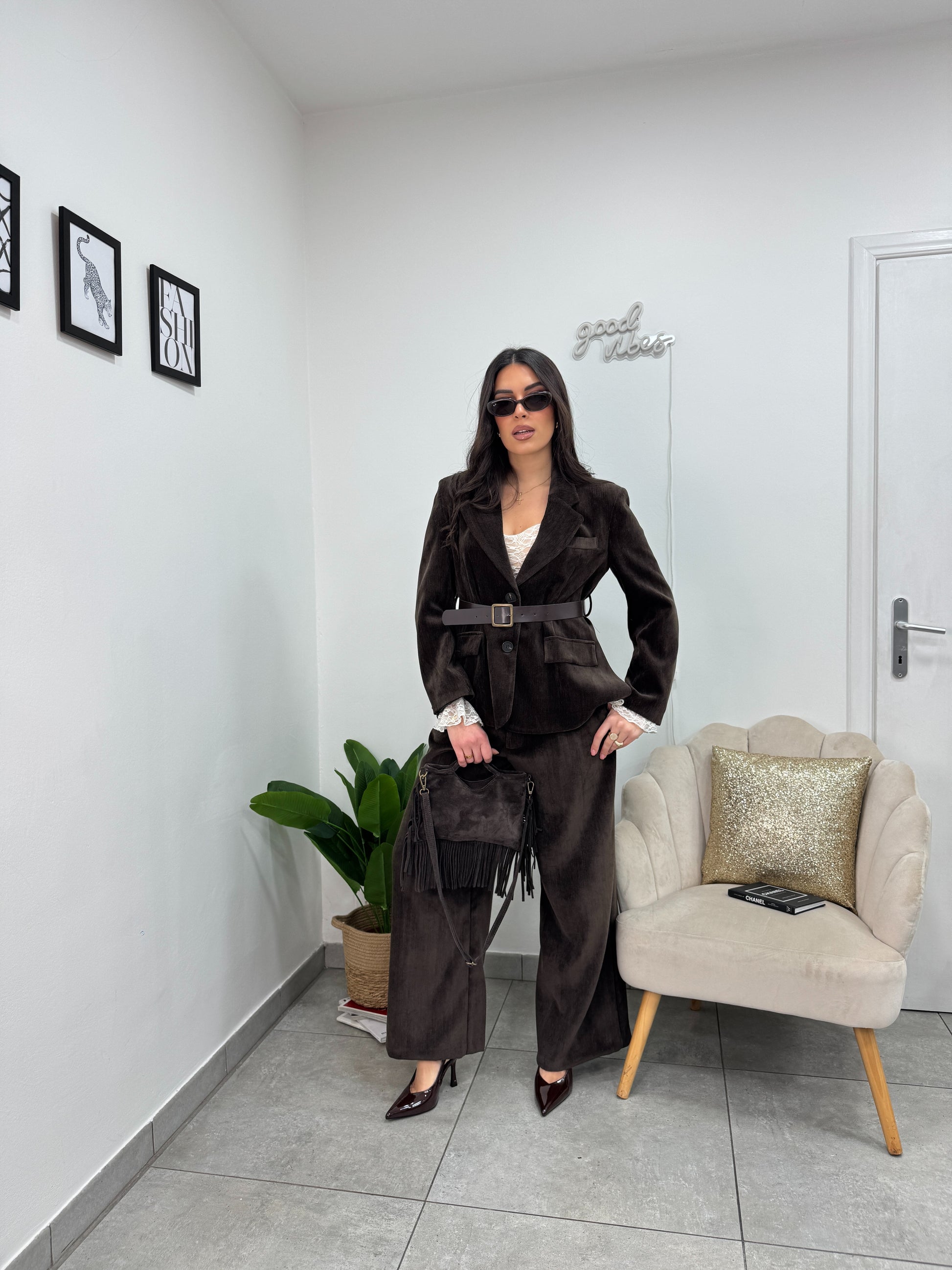 Giacca in velluto con spalline incorporate, tasche finte e cintura compresa.