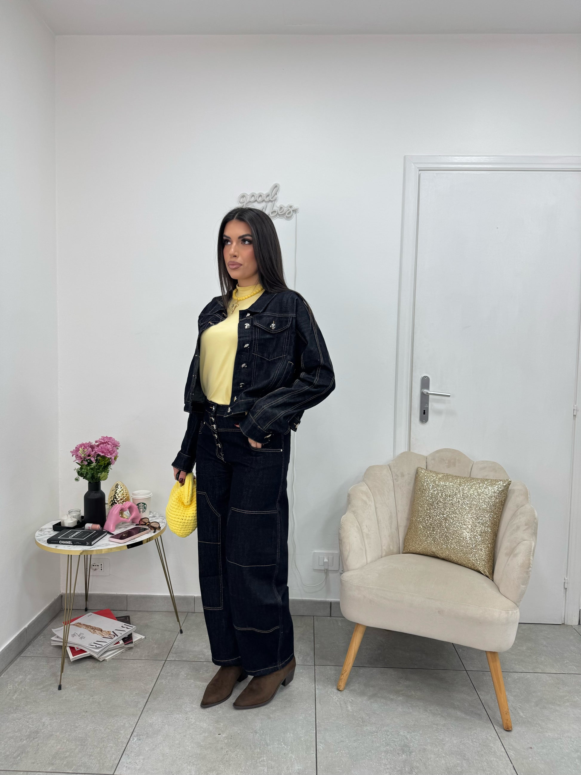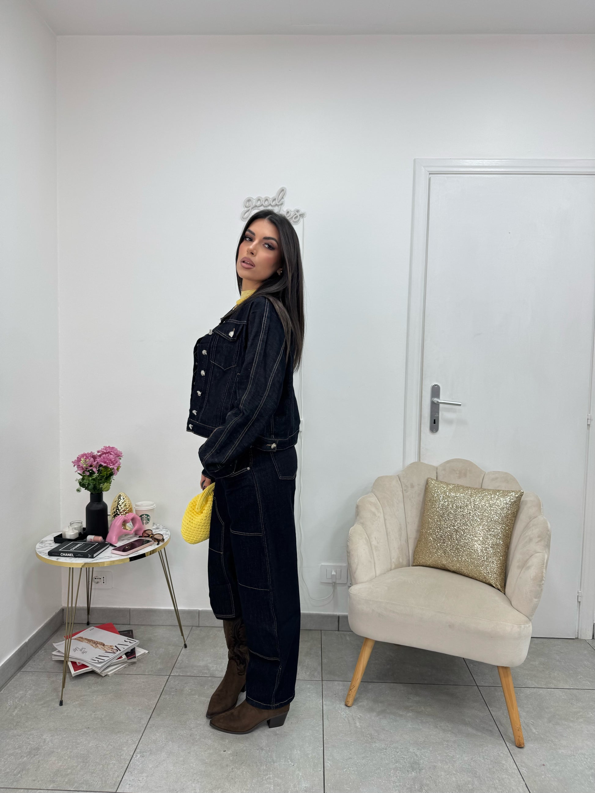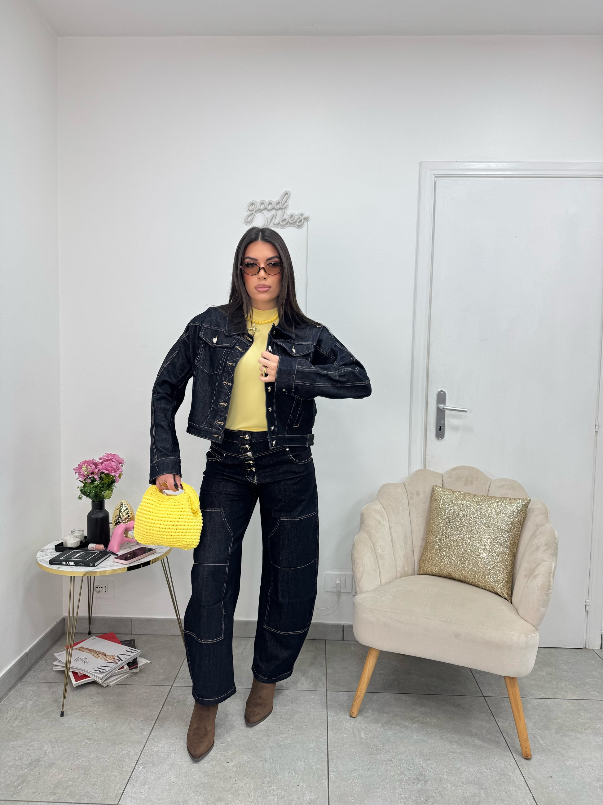Jeans blu scuro modello balloon a vita alta con bottoni gioiello argento e cuciture beige.