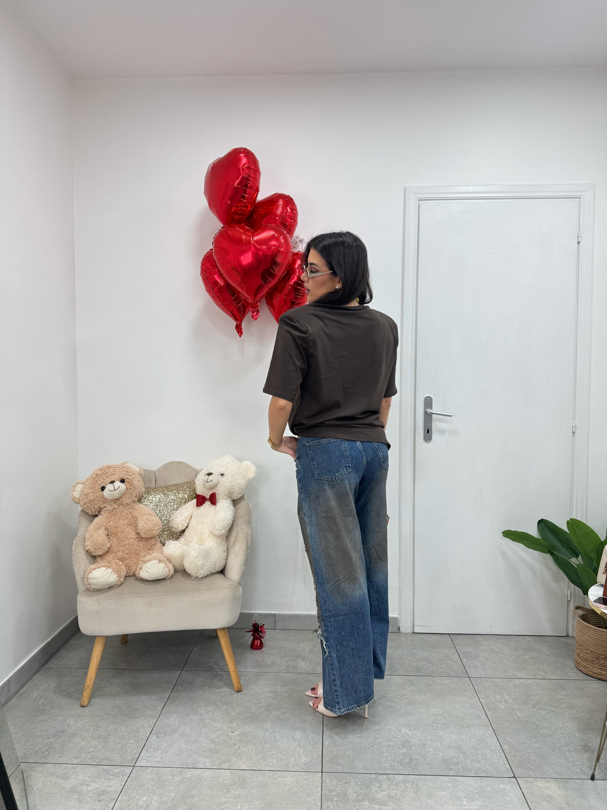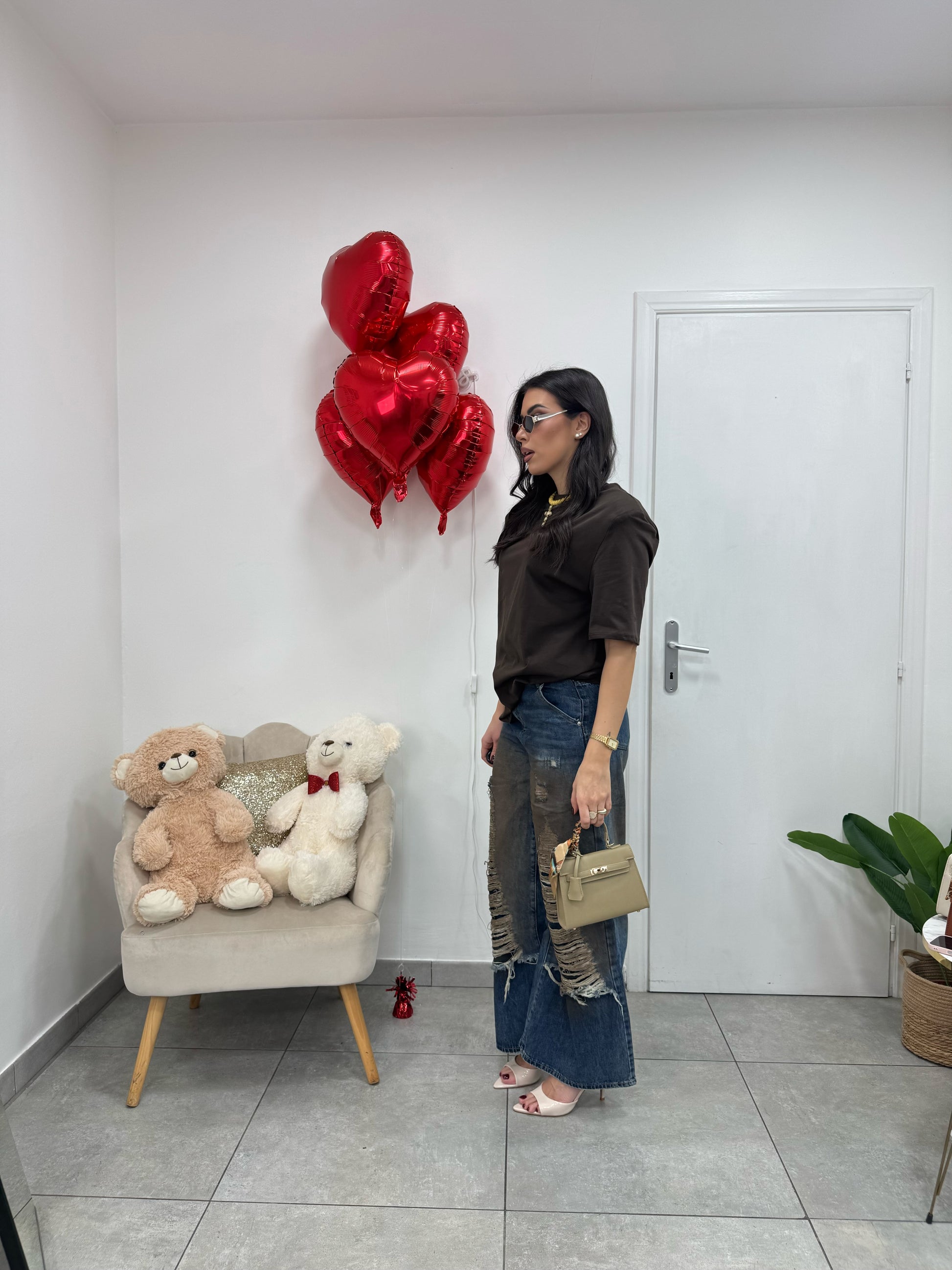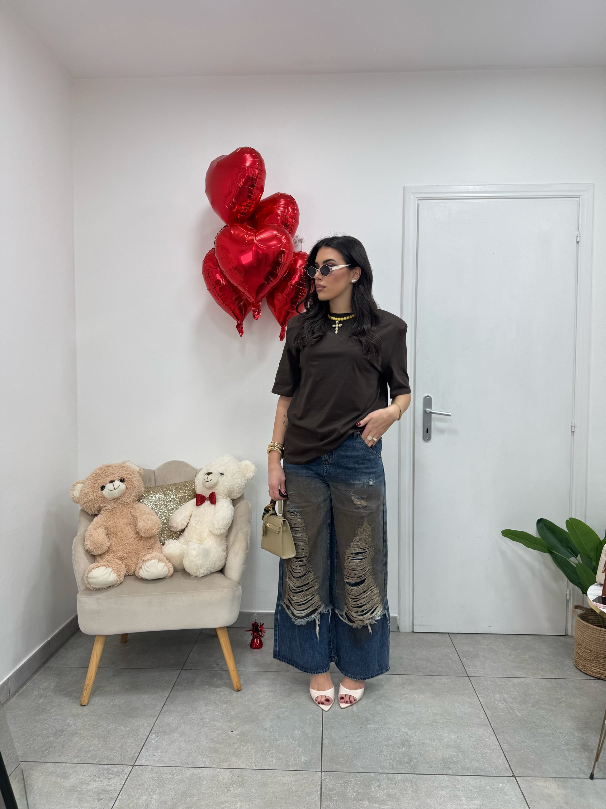 Jeans in Denim scuro con strappi foderati con paint marrone. Gamba a palazzo.