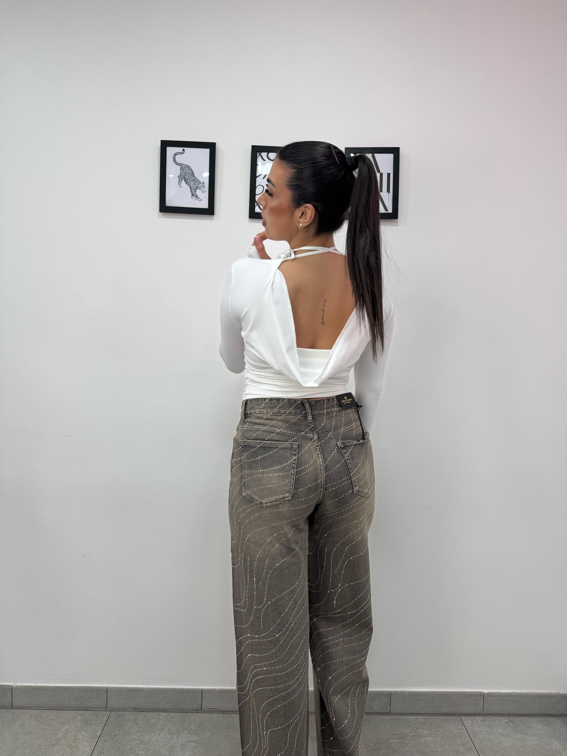 Maglia con manica a guanto, laccio dietro il collo e schiena scoperta.