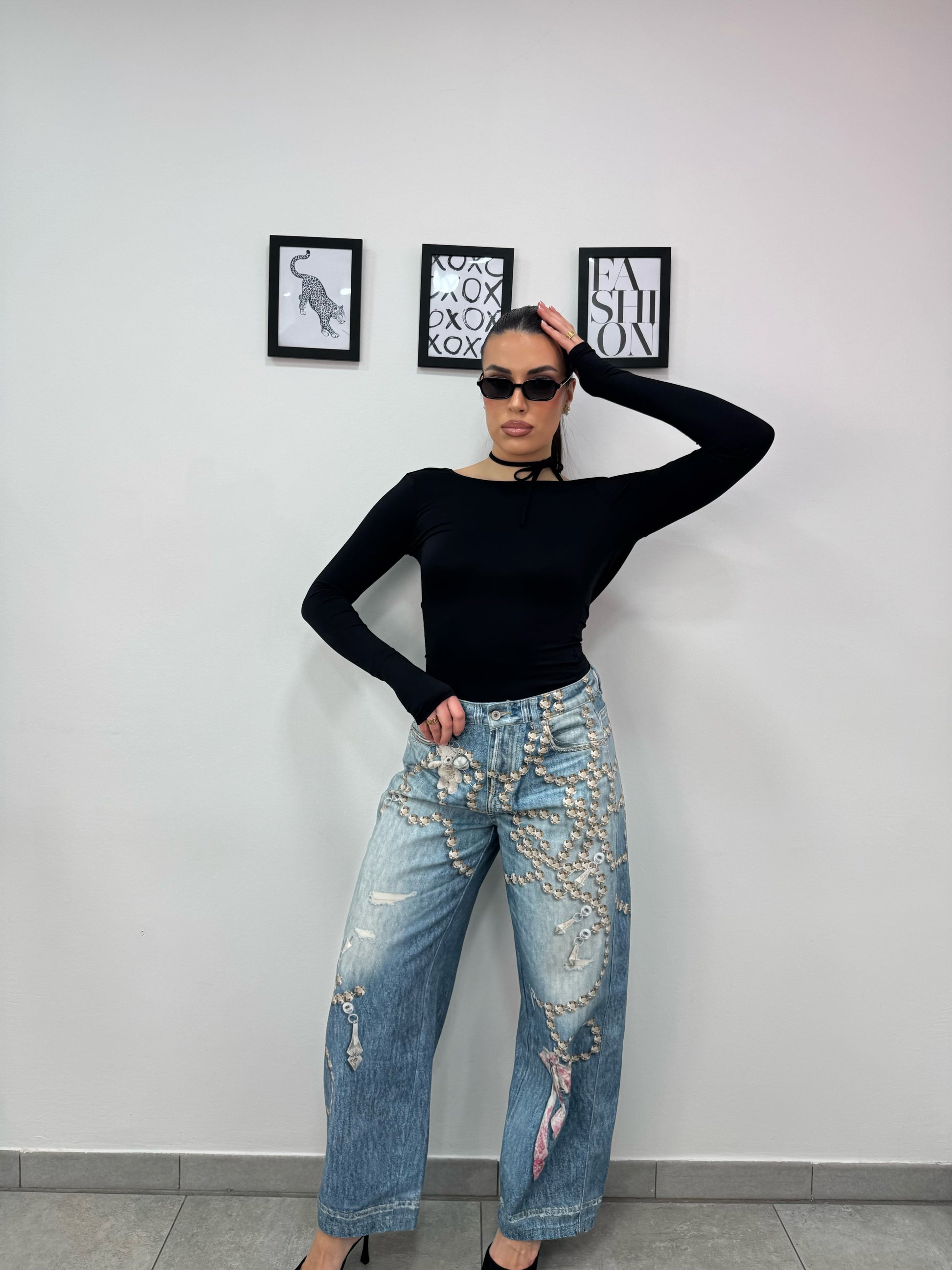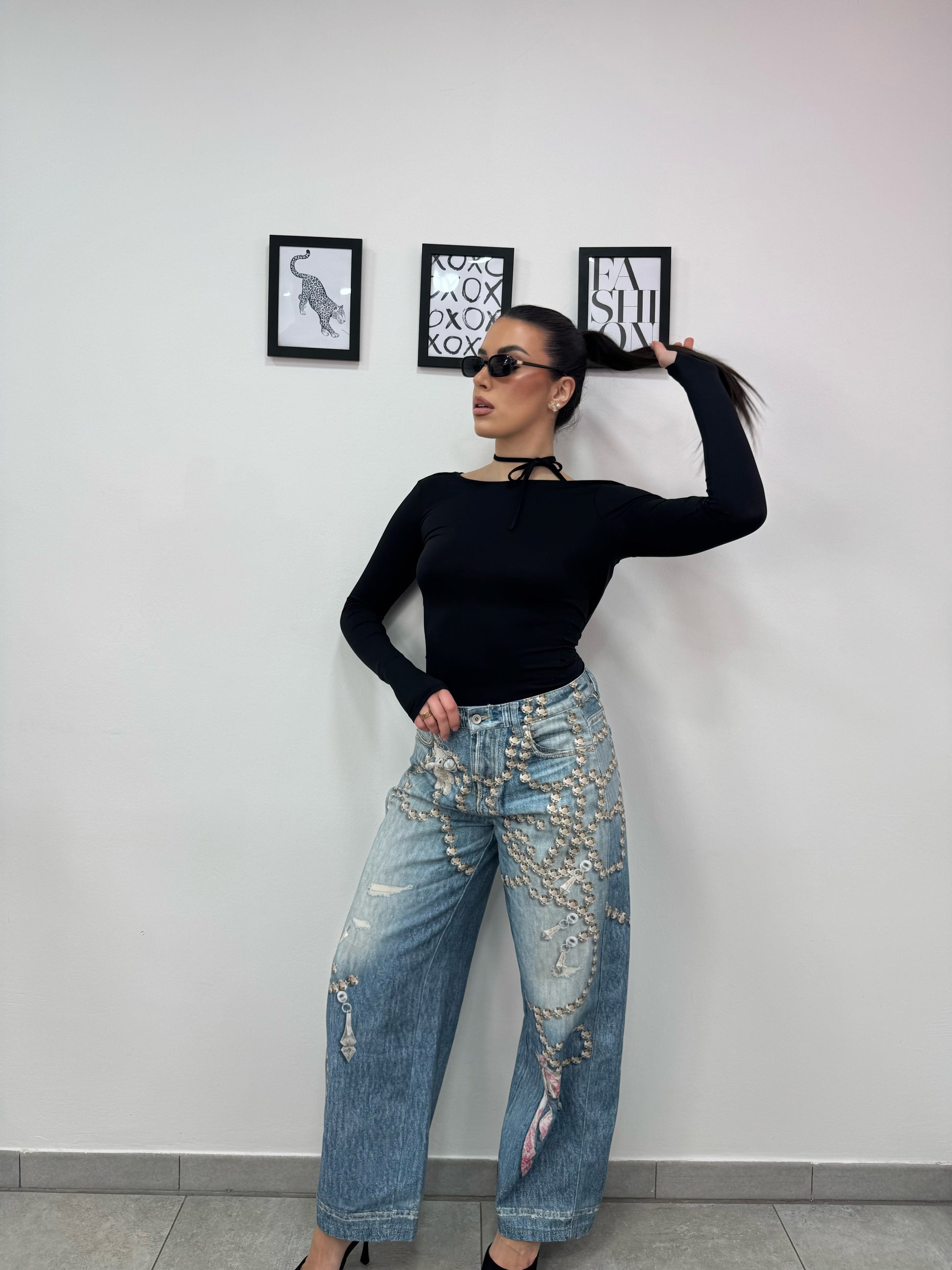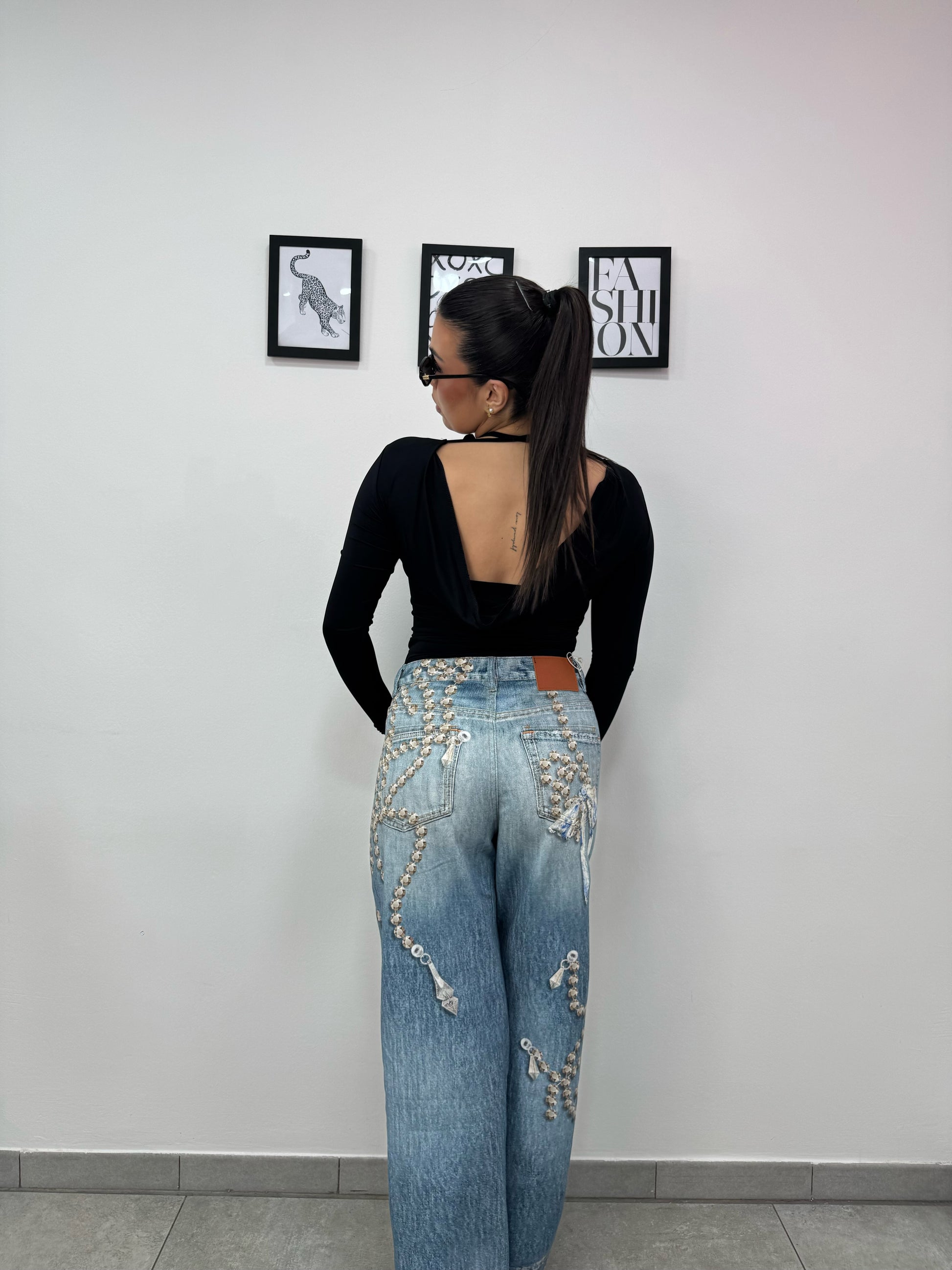 Maglia con manica a guanto, laccio dietro il collo e schiena scoperta.