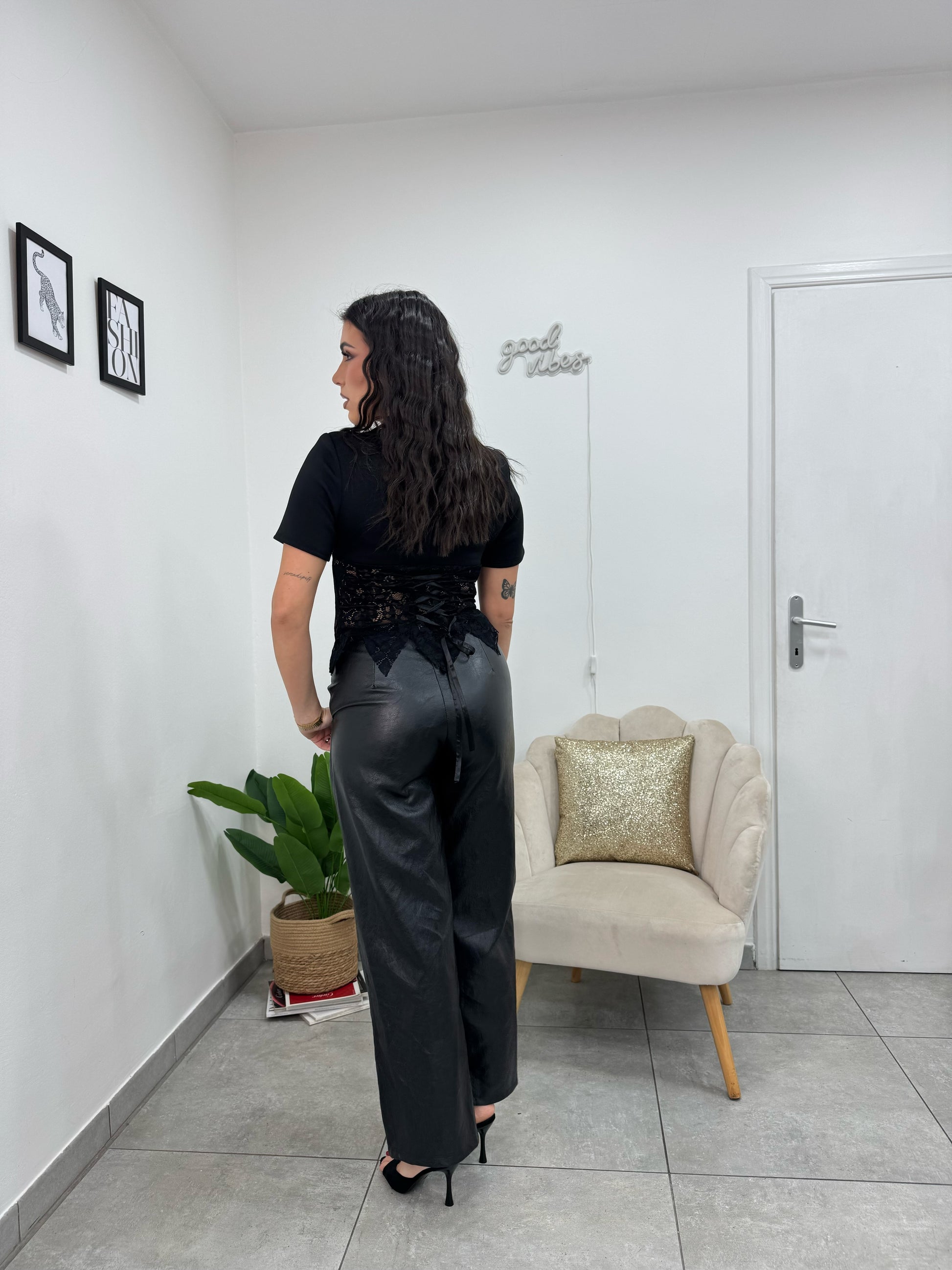 Maglia manica corta con spalline, corsetto in pizzo, regolabile dietro con nastro.