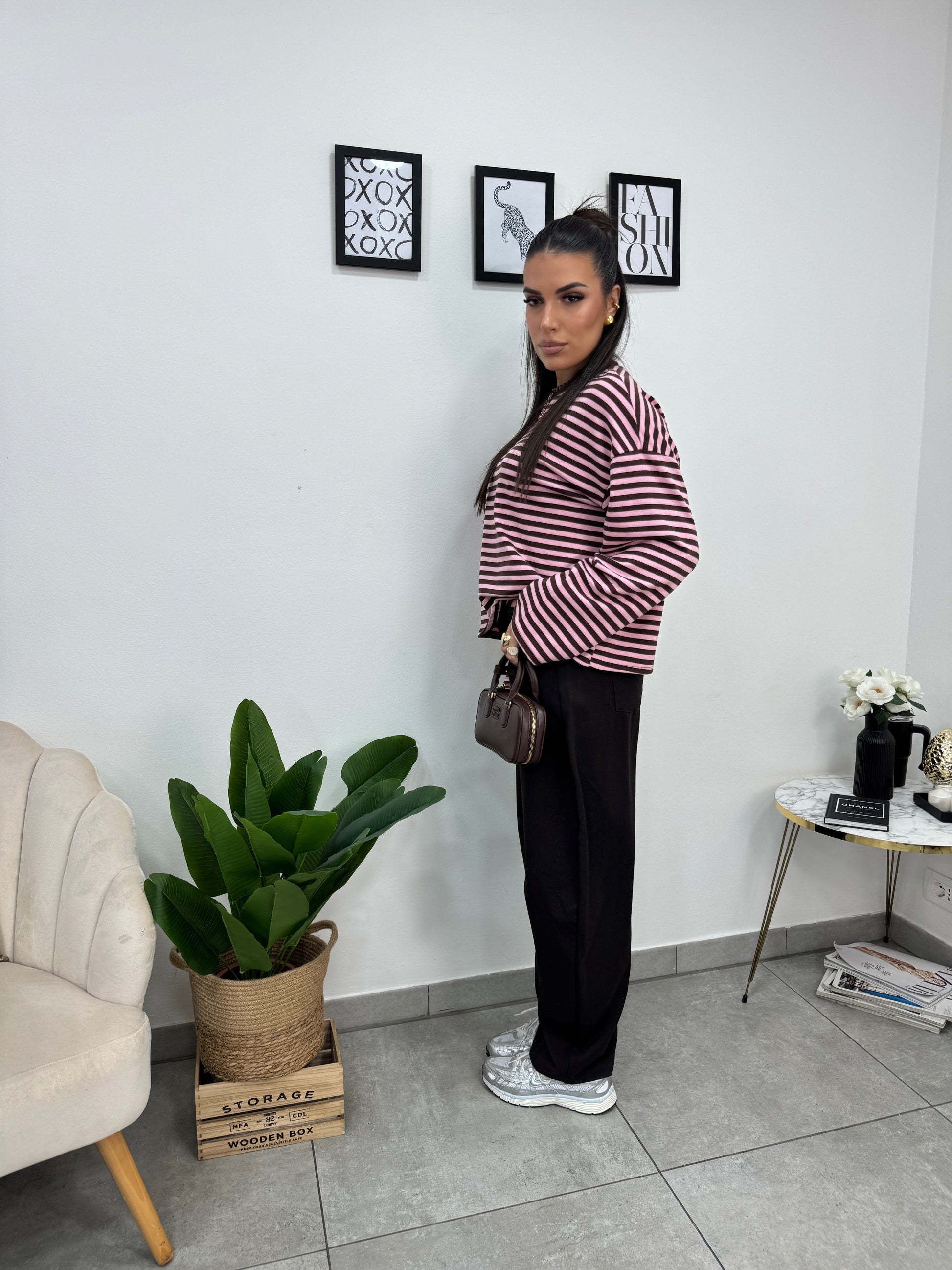Maglia over a righe girocollo con manica ampia, garzata internamente.