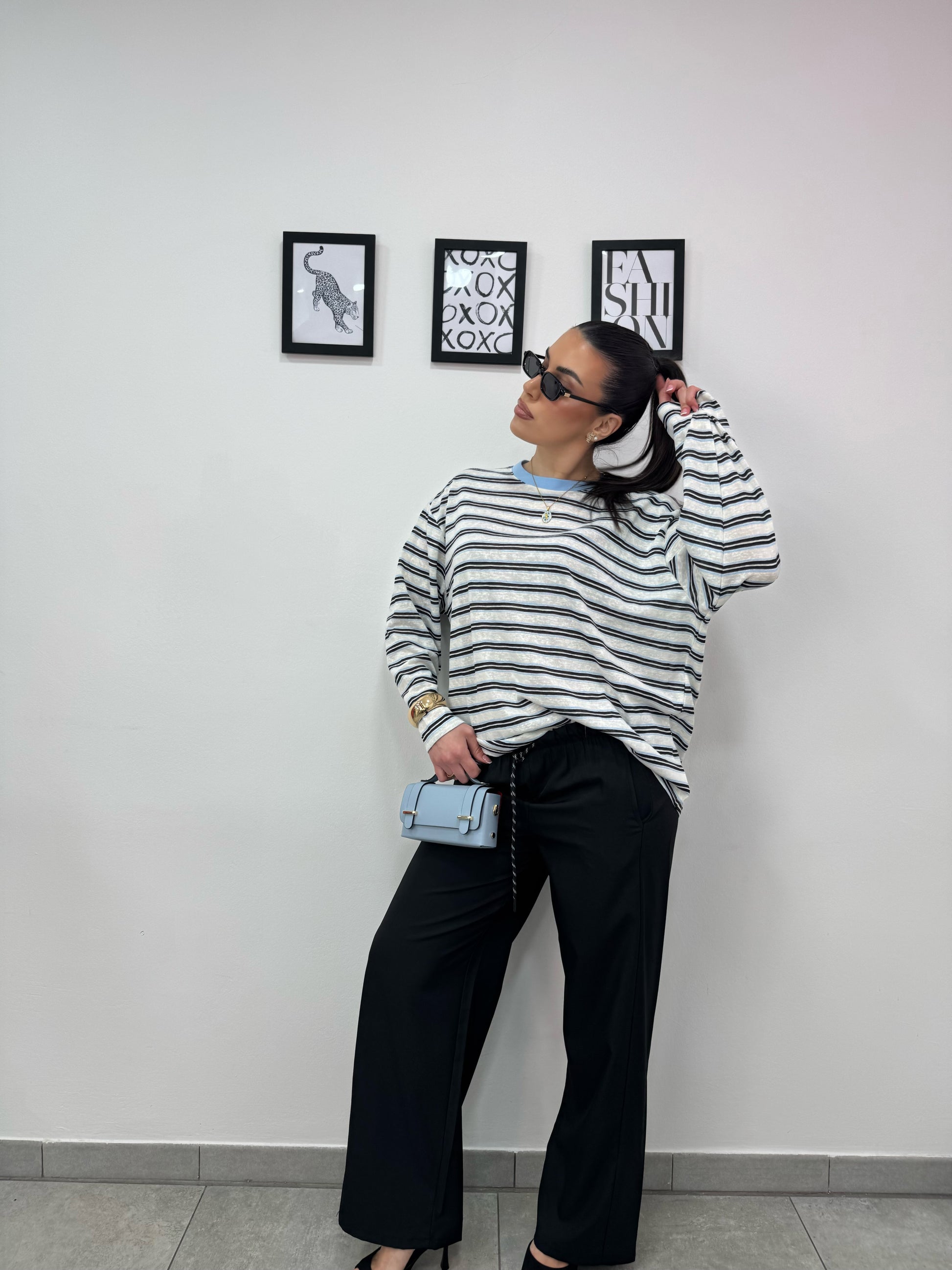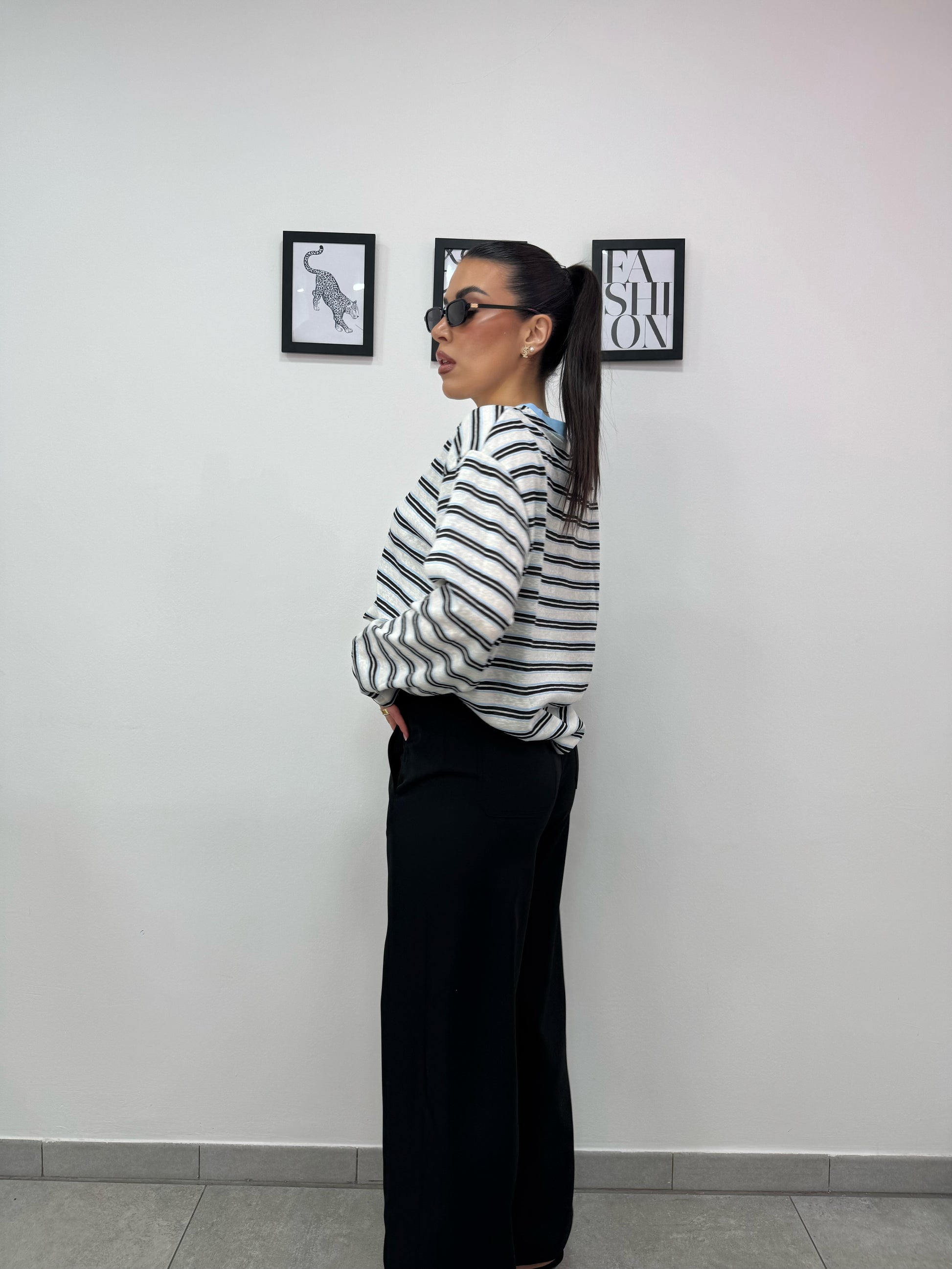 Pantalone palazzo con coulisse, laccio mood corda, elastico in vita. Tasche sul retro.