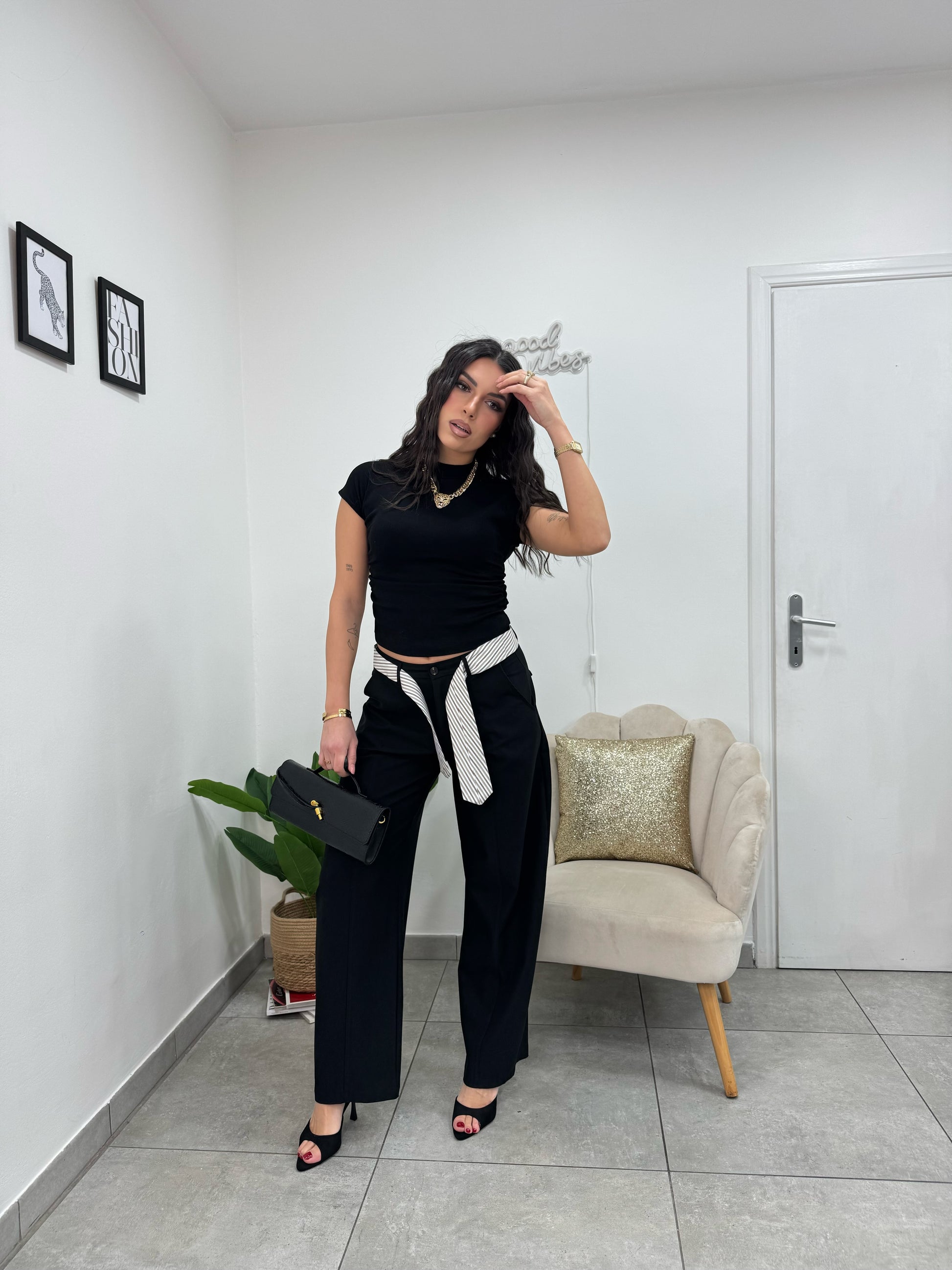 Pantalone nero balloon con bottone e passanti, dotato di cravatta rimuovile.
