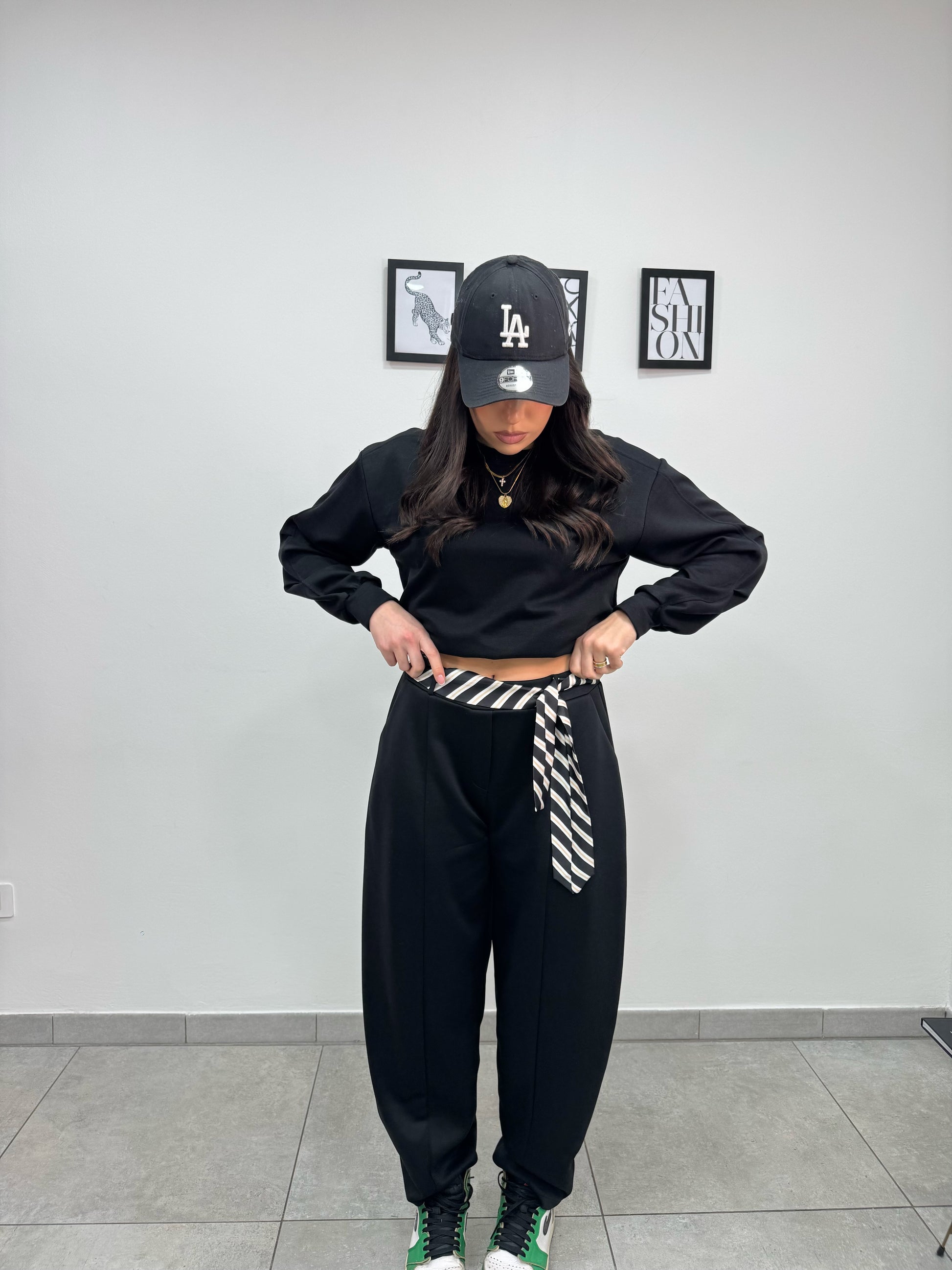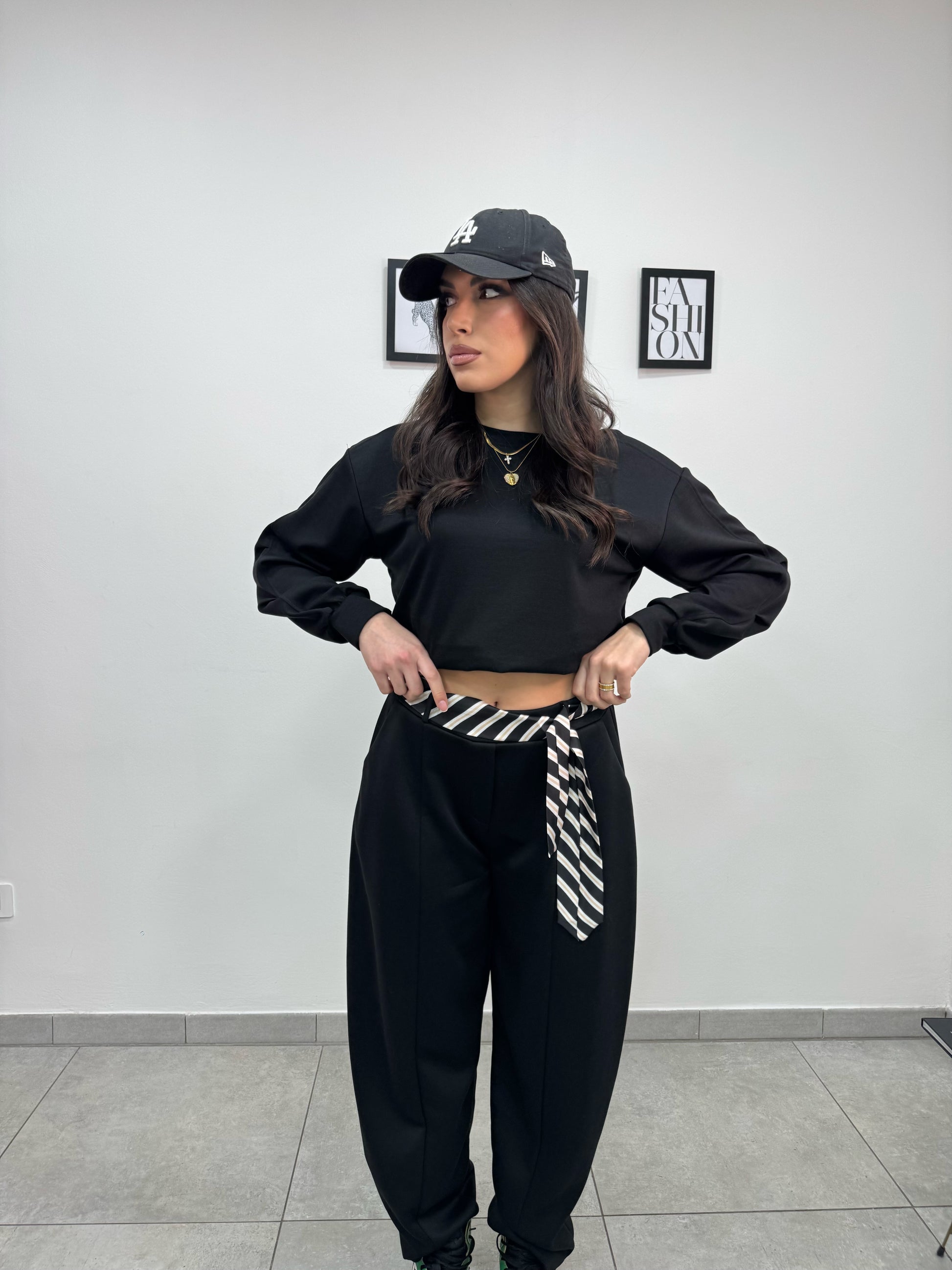 Pantalone tuta modello balloon con tasche, elastico in vita e cintura mood cravatta a righe.