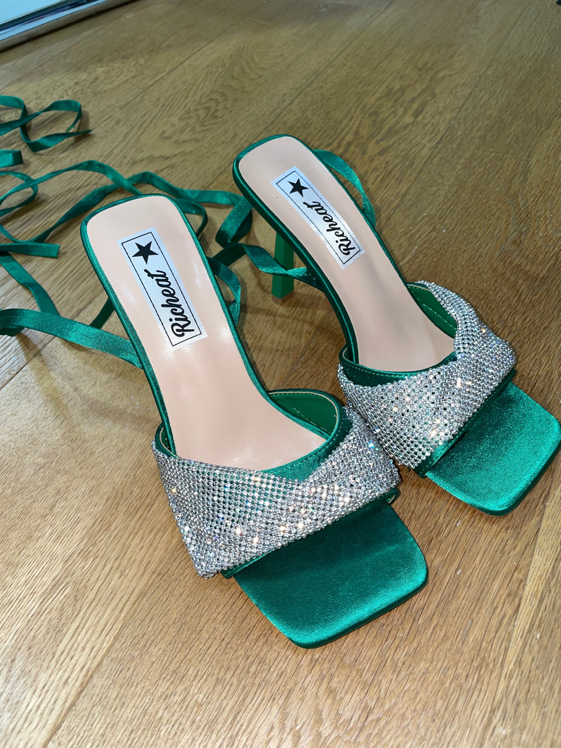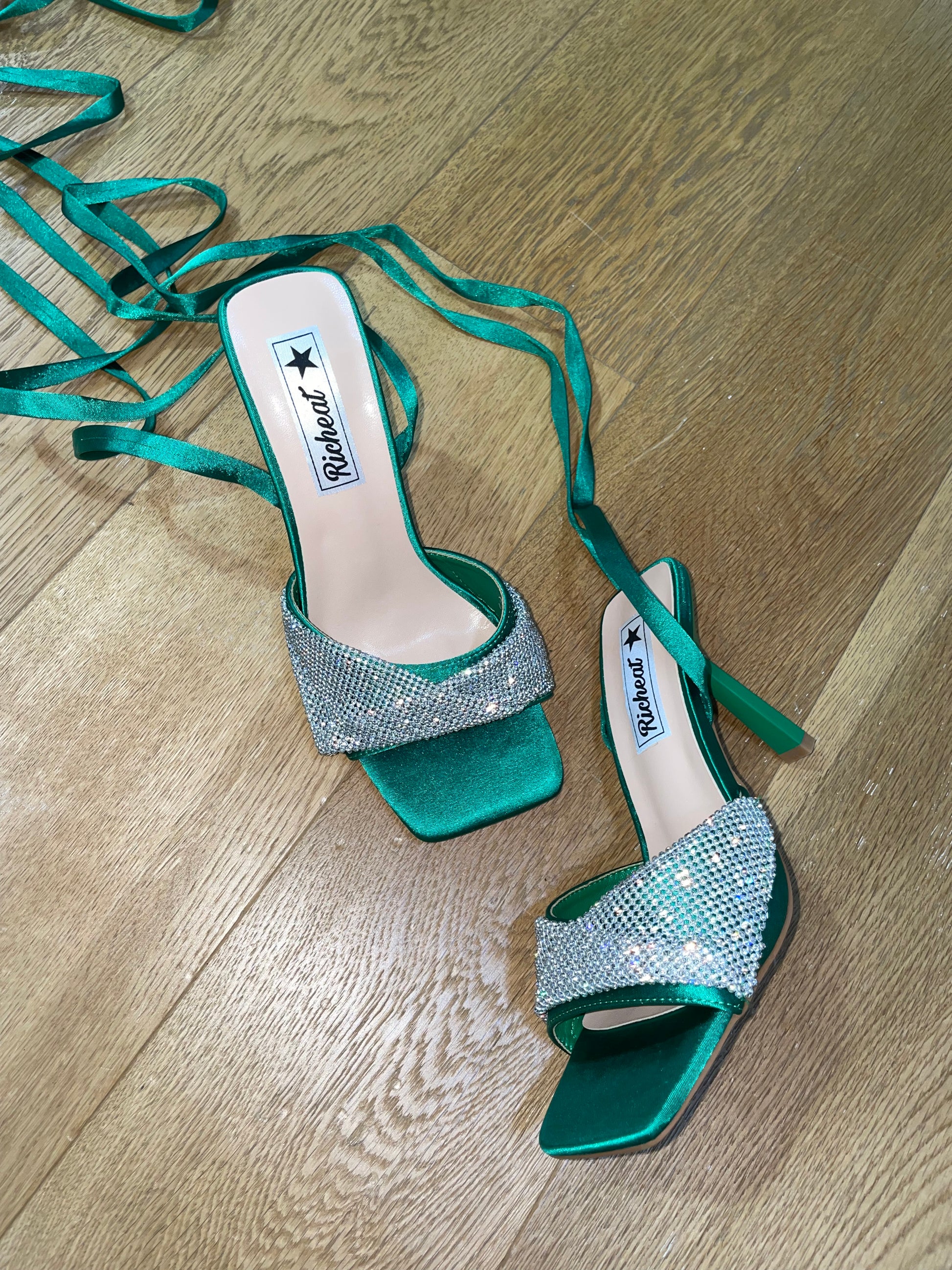 Sandali con tacco e lacci alla caviglia, punta squadrata. Altezza tacco 7 cm.
