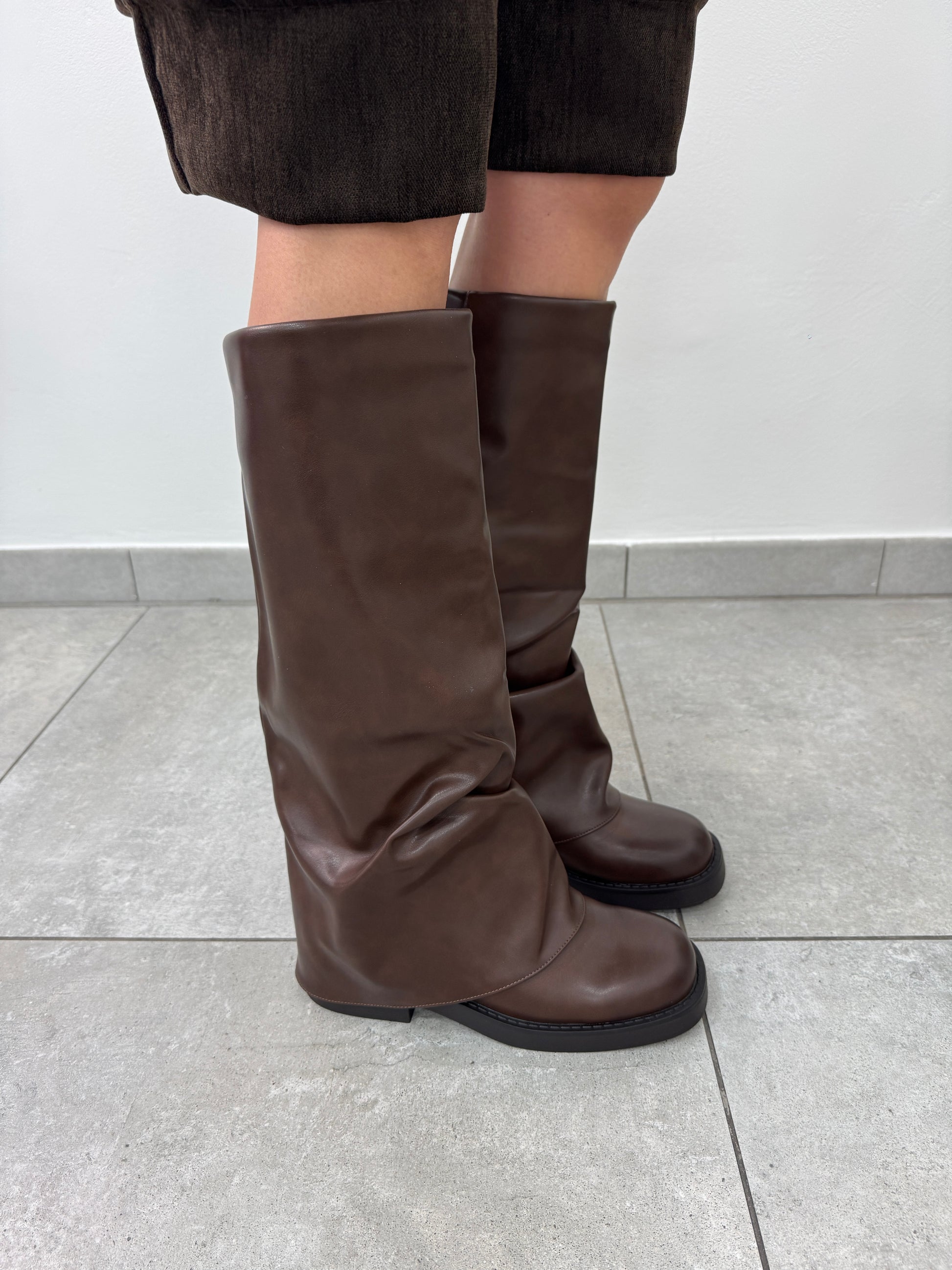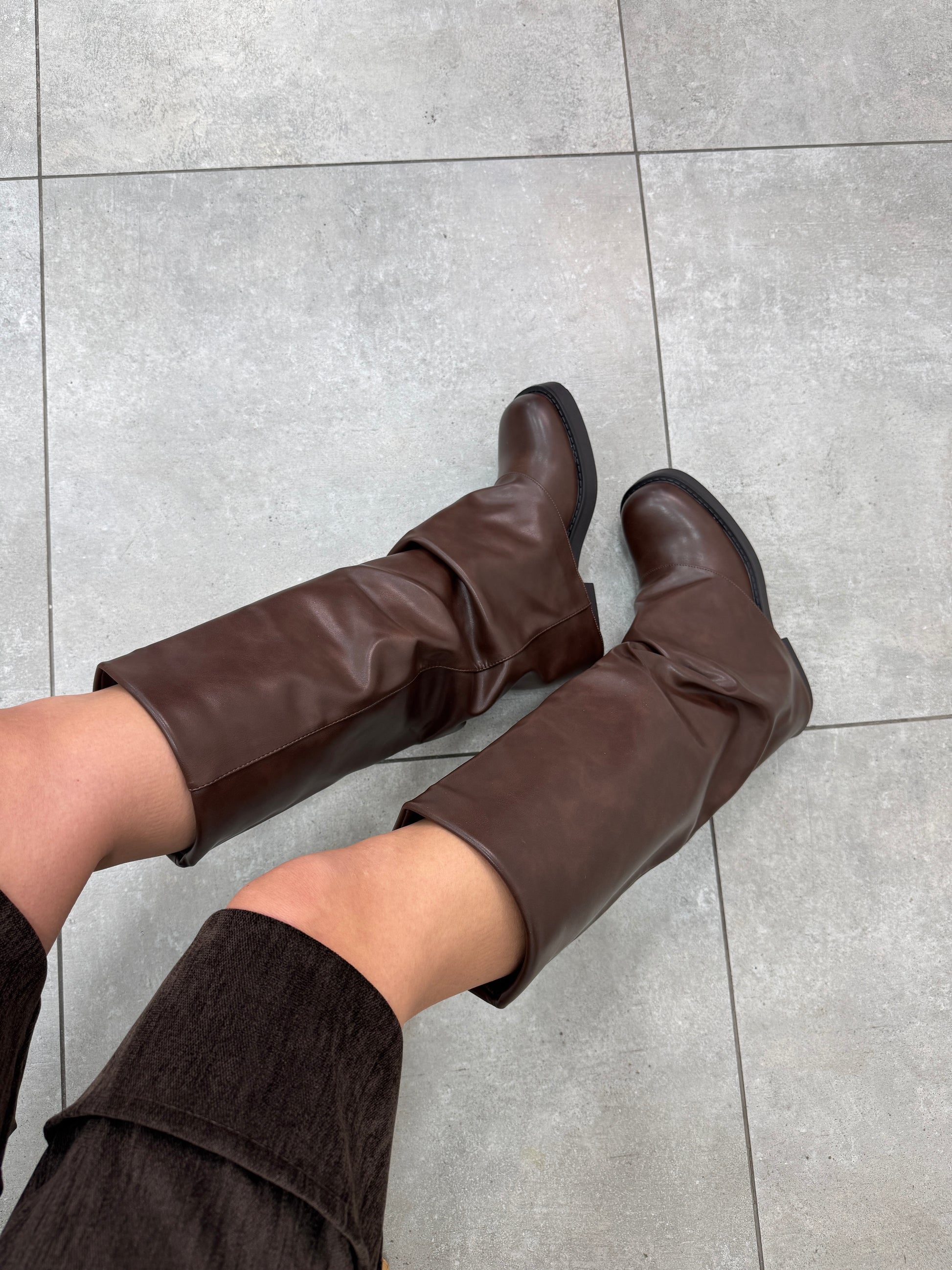 Stivale alto in ecopelle con punta leggermente quadrata e risvolto.