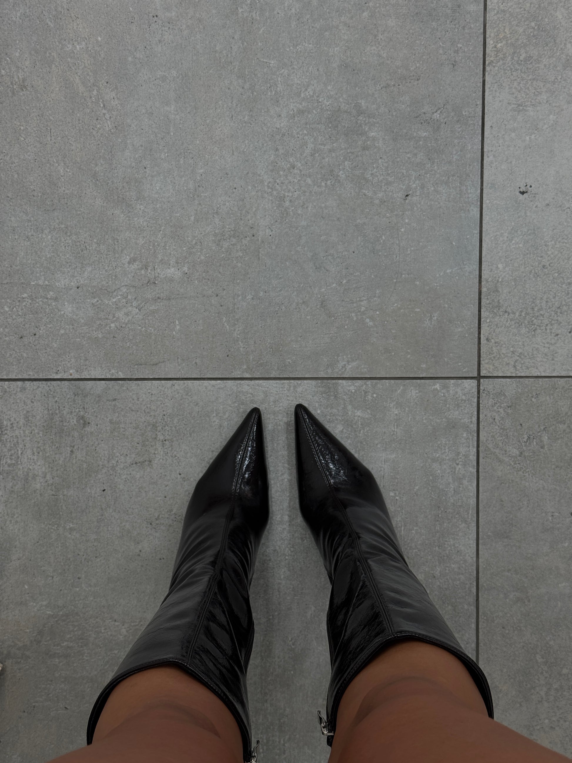 Stivali ecopelle lucidi effetto vernice con tacco fino, circa 6 cm.